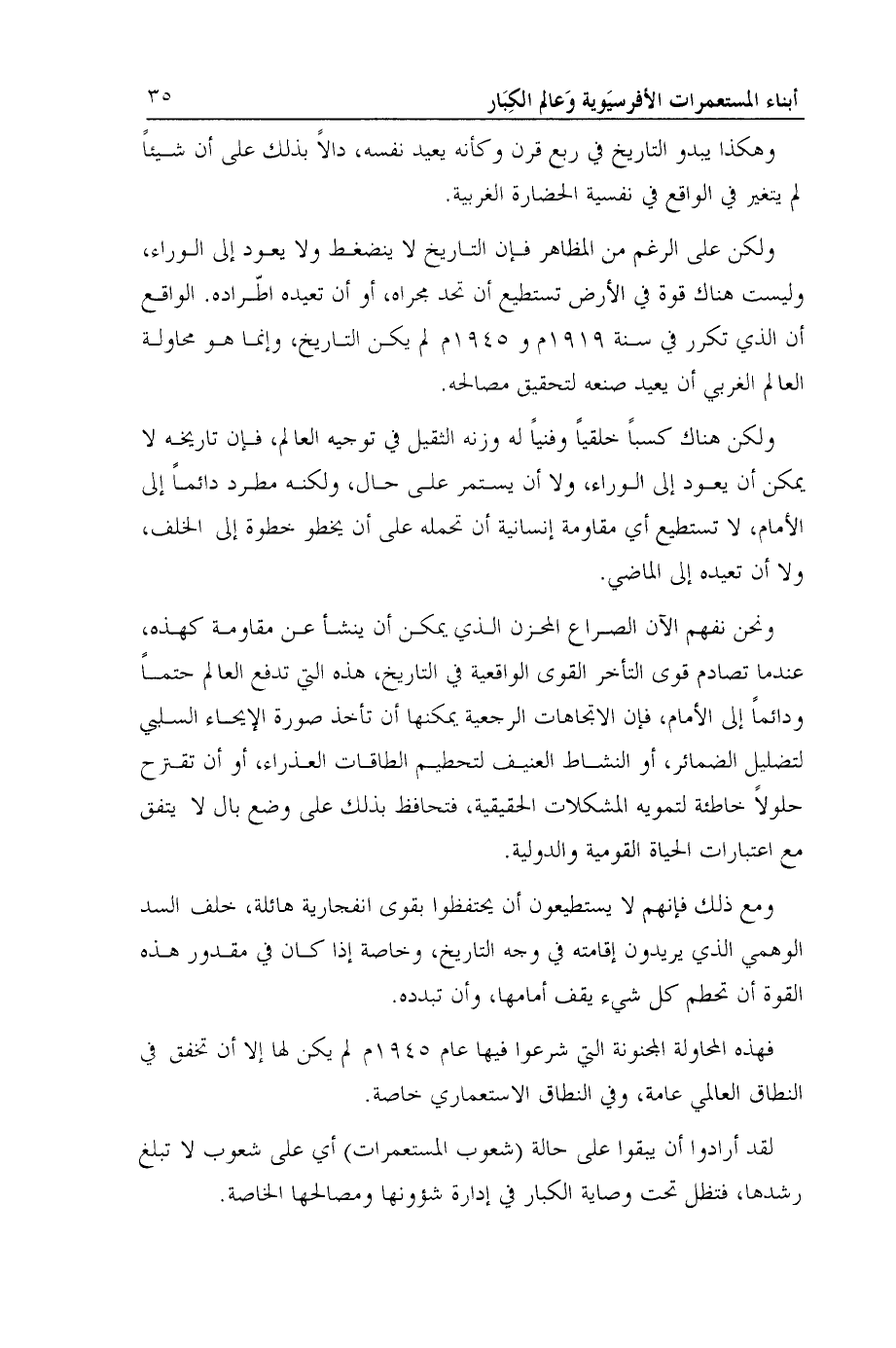ولكن على الرغم من المظاهر فإن التاريخ لا ينضغط ولا يعود إلى الوراء، وليست هناك قوة في الأرض تستطيع أن تحد مجراه، أو أن تعيده اطّراده. الواقع أن الذي تكرر في سنة 1919م و1945م لم يكن التاريخ، وإنما هو محاولة العالم الغربي أن يعيد صنعه لتحقيق مصالحه.