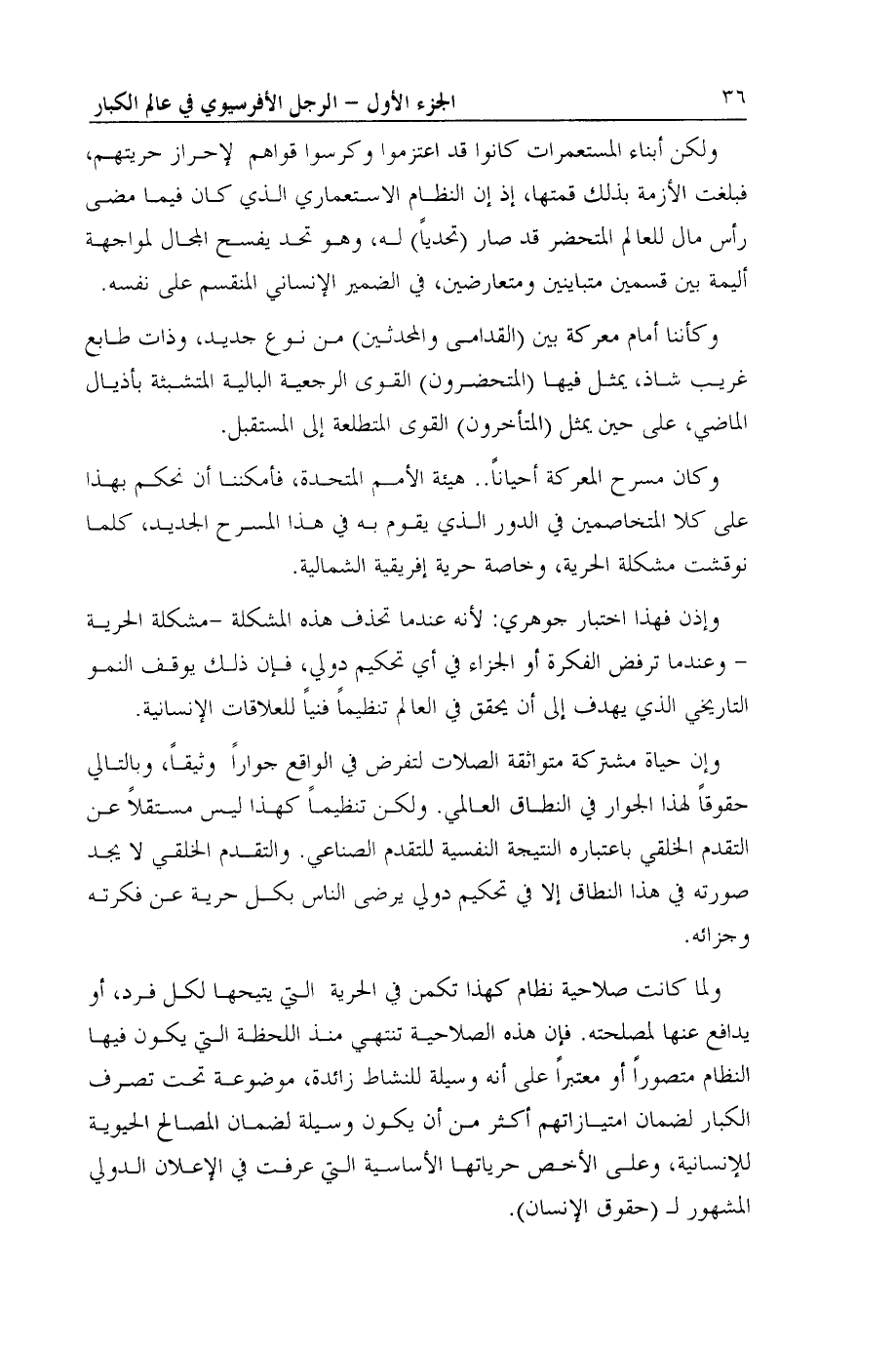 ولكن أبناء المستعمرات كانوا قد اعتزموا وكرسوا قواهم لإحراز حريتهم، فبلغت الأزمة بذلك قمتها، إذ إن النظام الاستعماري الذي كان فيما مضى رأس مال للعالم المتحضر قد صار (تحدياً) له، وهو تحد يفسح المجال لمواجهة أليمة بين قسمين متباينين ومتعارضين، في الضمير الإنساني المنقسم على نفسه.
