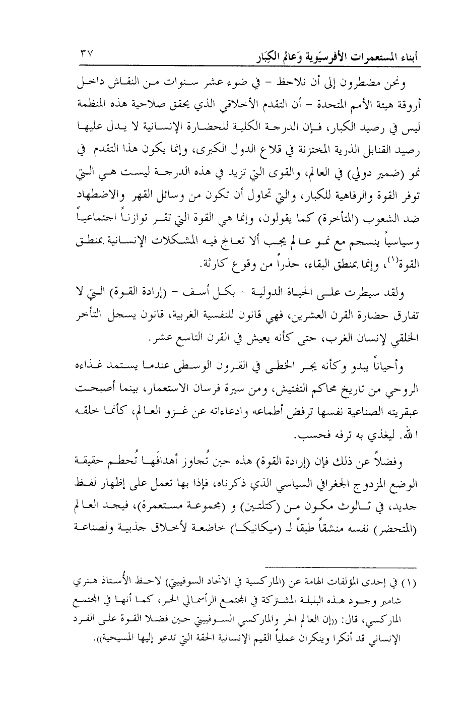 (¬1) في إحدى المؤلفات الهامة عن (الماركسية في الاتحاد السوفييتي) لاحظ الأُستاذ هنري شامبر وجود هذه البلبلة المشتركة في المحتمع الرأسمالي الحر، كما أنها في المجتمع الماركسي، قال: ((إن العالم الحر والماركسي السوفييتي حين فضلا القوة على الفرد الإنساني قد أنكرا وينكران عملياً القيم الإنسانية الحقة التي تدعو إليها المسيحية)).