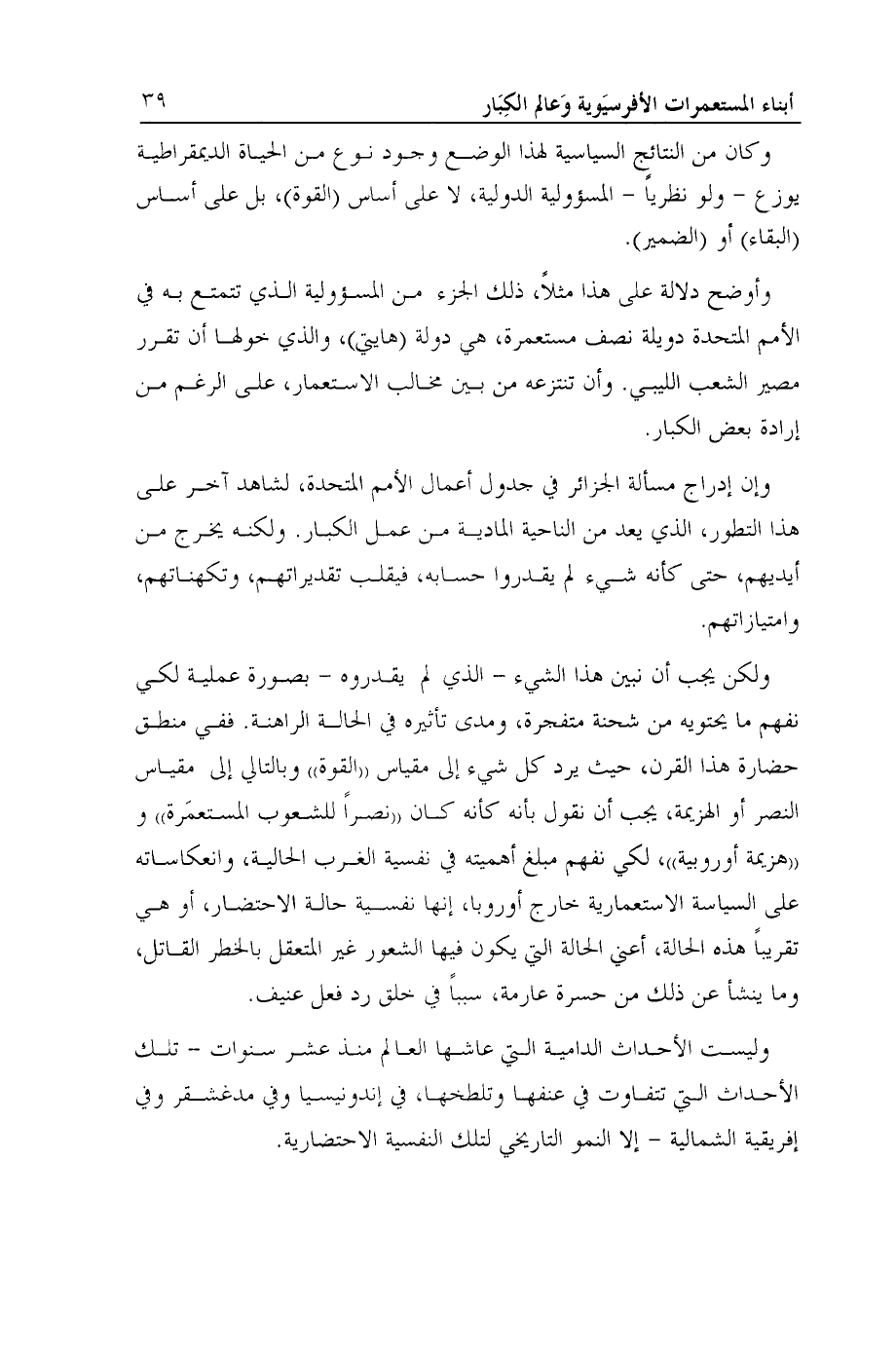 وليست الأحداث الدامية التي عاشها العالم منذ عشر سنوات- تلك الأحداث التي تتفاوت في عنفها وتلطخها، في إندونيسيا وفي مدغشقر وفي إفريقية الشمالية- إلا النمو التاريخي لتلك النفسية الاحتضارية.