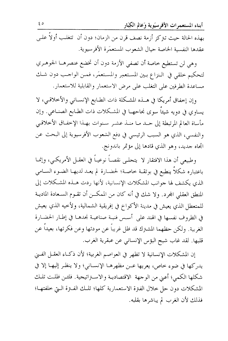 وإن إخفاق أمريكا في هذه المشكلة ذات الطابع الإنساني والأخلاقي، لا يساوي في دويه شيئاً سوى نجاحها في المشكلات ذات الطابع الصناعي. وإن مأساة العالم المرتبطة إلى حد ما منذ عشر سنوات بهذا الإخفاق الأخلاقي والنفسي، الذي هو السبب الرئيسي في دفع الشعوب الأفرسيوية إلى البحث عن اتجاه جديد، وهو الذي قادها إلى مؤتمر باندونج.