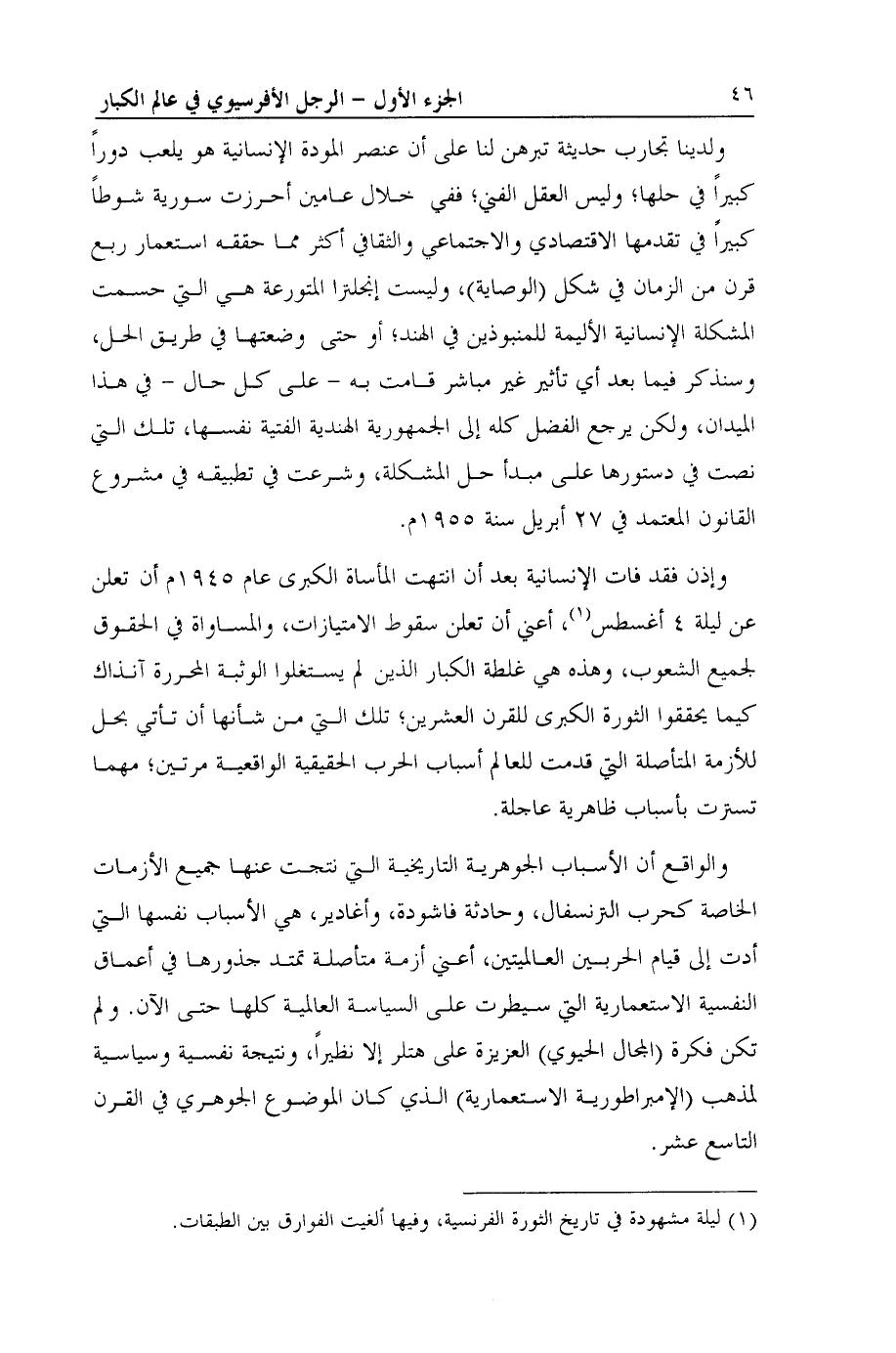 وإذن فقد فات الإنسانية بعد أن انتهت المأساة الكبرى عام 1945م أن تعلن عن ليلة 4 أغسطس (¬1)، أعني أن تعلن سقوط الامتيازات، والمساواة في الحقوق لجميع الشعوب، وهذه هي غلطة الكبار الذين لم يستغلوا الوثبة المحررة آنذاك كيما يحققوا الثورة الكبرى للقرن العشرين، تلك التي من شأنها أن تأتي بحل للأزمة المتأصلة التي قدمت للعالم أسباب الحرب الحقيقية الواقعية مرتين؛ مهما تسترت بأسباب ظاهرية عاجلة.