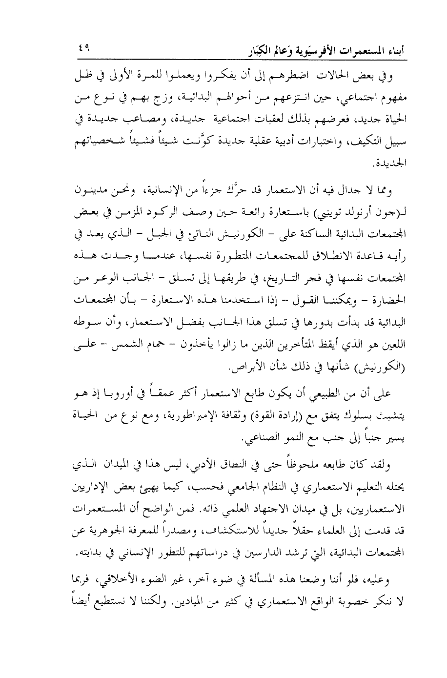 ومما لا جدال فيه أن الاستعمار قد حرَّك جزءاً من الإنسانية، ونحن مدينون لـ (جون أرنولد تويبي) باستعارة رائعة حين وصف الركود المزمن في بعض المجتمعات البدائية الساكنة على- الكورنيش الناتئ في الجبل- الذي يعد في رأيه قاعدة الانطلاق للمجتمعات المتطورة نفسها، عندما وجدت هذه المجتمعات نفسها في فجر التاريخ، في طريقها إلى تسلق- الجانب الوعر من الحضارة- ويمكننا القول- إذا استخدمنا هذه الاستعارة- بأن المجتمعات البدائية قد بدأت بدورها في تسلق هذا الجانب بفضل الاستعمار، وأن سوطه اللعين هو الذي أيقظ المتأخرين الذين ما زالوا يأخذون- حمام الشمس- على (الكورنيش) شأنها في ذلك شأن الأبراص.