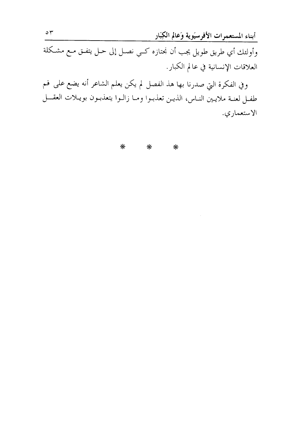 وفي الفكرة التي صدرنا بها هذ الفصل لم يكن يعلم الشاعر أنه يضع على فم طفل لعنة ملايين الناس، الذين تعذبوا وما زالوا يتعذبون بويلات العقل الاستعماري.