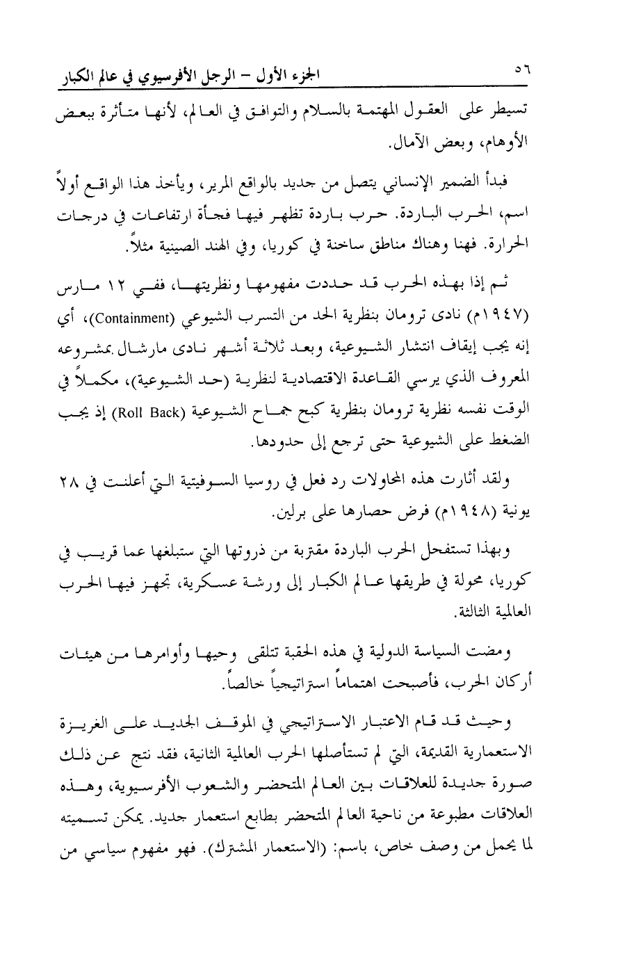 وحيث قد قام الاعتبار الاستراتيجي في الموقف الجديد على الغريزة الاستعمارية القديمة، التي لم تستأصلها الحرب العالمية الثانية، فقد نتج عن ذلك صورة جديدة للعلاقات بين العالم المتحضر والشعوب الأفرسيوية، وهذه العلاقات مطبوعة من ناحية العالم المتحضر بطابع استعمار جديد. يمكن تسميته لما يحمل من وصف خاص، باسم: (الاستعمار المشترك). فهو مفهوم سياسي من