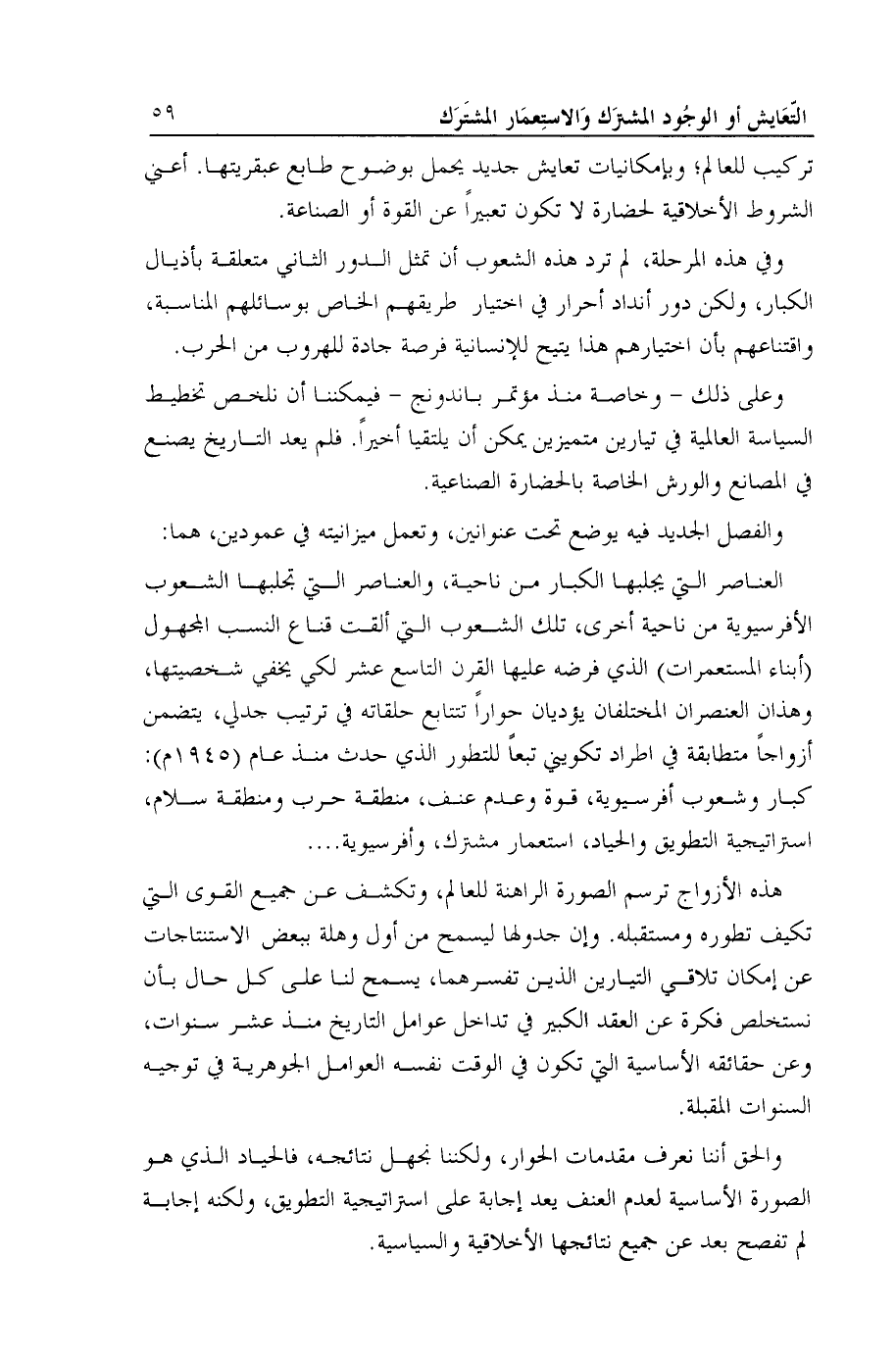 والفصل الجديد فيه يوضع تحت عنوانين، وتعمل ميزانيته في عمودين، هما: العناصر التي يجلبها الكبار من ناحية، والعناصر التي تجلبها الشعوب الأفرسيوية من ناحية أخرى، تلك الشعوب التي ألقت قناع النسب المجهول (أبناء المستعمرات) الذي فرضه عليها القرن التاشع عشر لكي يخفي شخصيتها، وهذان العنصران المختلفان يؤديان حواراً تتتابع حلقاته في ترتيب جدلي، يتضمن أزواجاً متطابقة في اطراد تكويني تبعاً للتطور الذي حدث منذ عام (1945م): كبار وشعوب أفرسيوية، قوة وعدم عنف، منطقة حرب ومنطقة سلام، استراتيجية التطويق والحياد، استعمار مشترك، وأفرسيوية ....