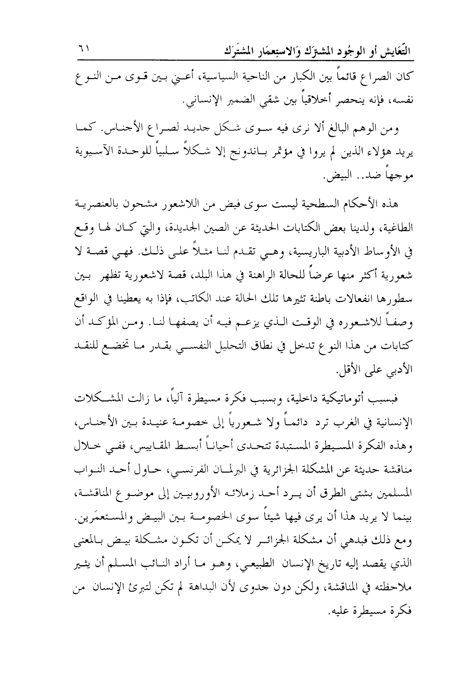فبسبب أتوماتيكية داخلية، وبسبب فكرة مسيطرة آلياً، ما زالت المشكلات الإنسانية في الغرب ترد دائماً ولا شعورياً إلى خصومة عنيدة بين الأجناس، وهذه الفكرة المصيطرة المستبدة تتحدى أحياناً أبسط المقاييس، ففي خلال مناقشة حديثة عن المشكلة الجزائرية في البرلمان الفرنسي، حاول أحد النواب المسلمين بشتى الطرق أن يرد أحد زملائه الأوروبيين إلى موضوع المناقشة، بينما لا يريد هذا أن يرى فيها شيئاً سوى الخصومة بين البيض والمستعمَرين. ومع ذلك فبدهي أن مشكلة الجزائر لا يمكن أن تكون مشكلة بيض بالمعنى الذي يقصد إليه تاريخ الإنسان الطبيعي، وهو ما أراد النائب المسلم أن يثير ملاحظته في المناقشة، ولكن دون جدوى لأن البداهة لم تكن لتبرئ الإنسان من فكرة مسيطرة عليه.