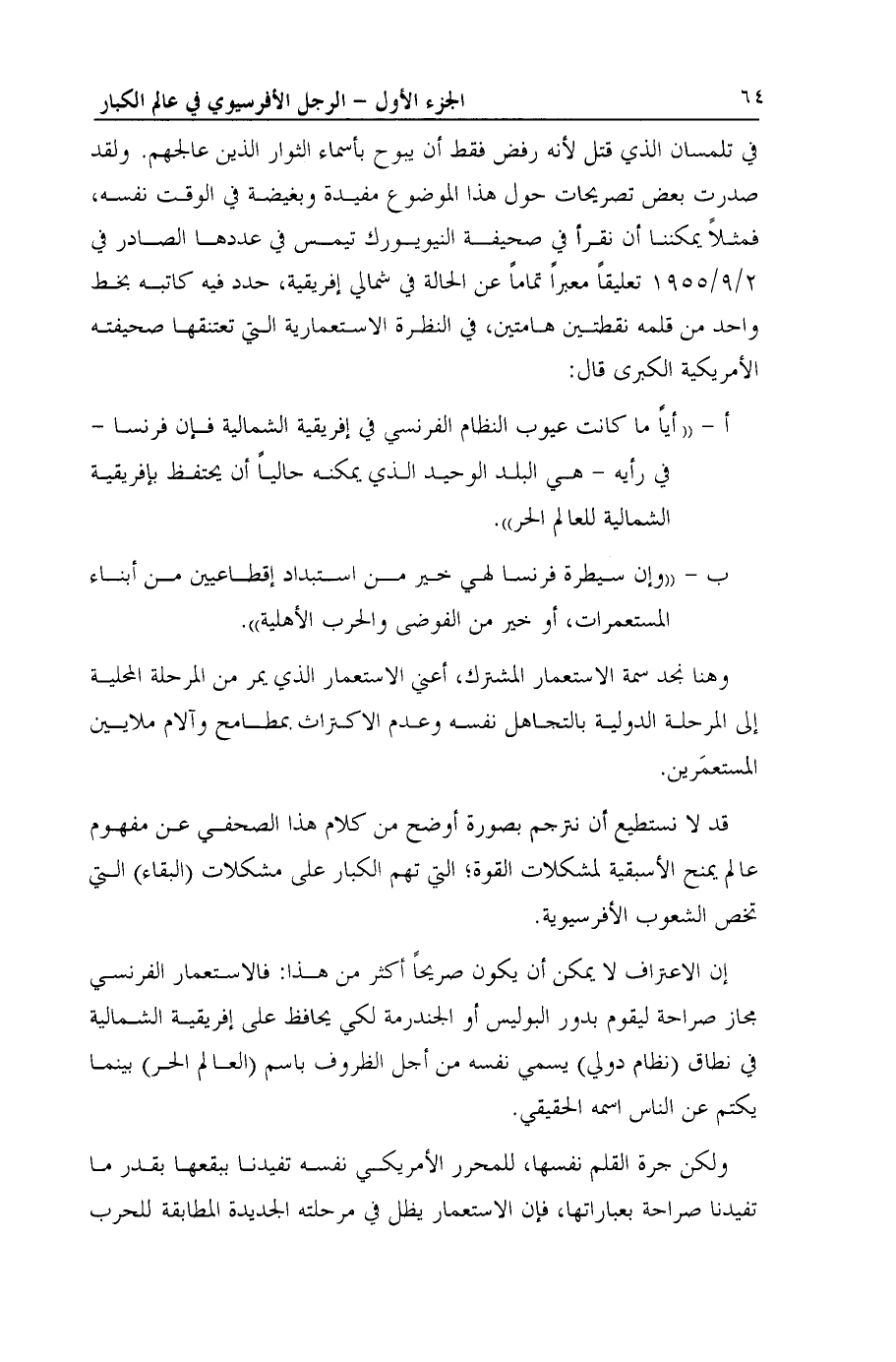 أ- ((أياً ما كانت عيوب النظام الفرنسي في إفريقية الشمالية فإن فرنسا- في رأيه- هي البلد الوحيد الذي يمكنه حالياً أن يحتفظ بإفريقية الشمالية للعالم الحر)).