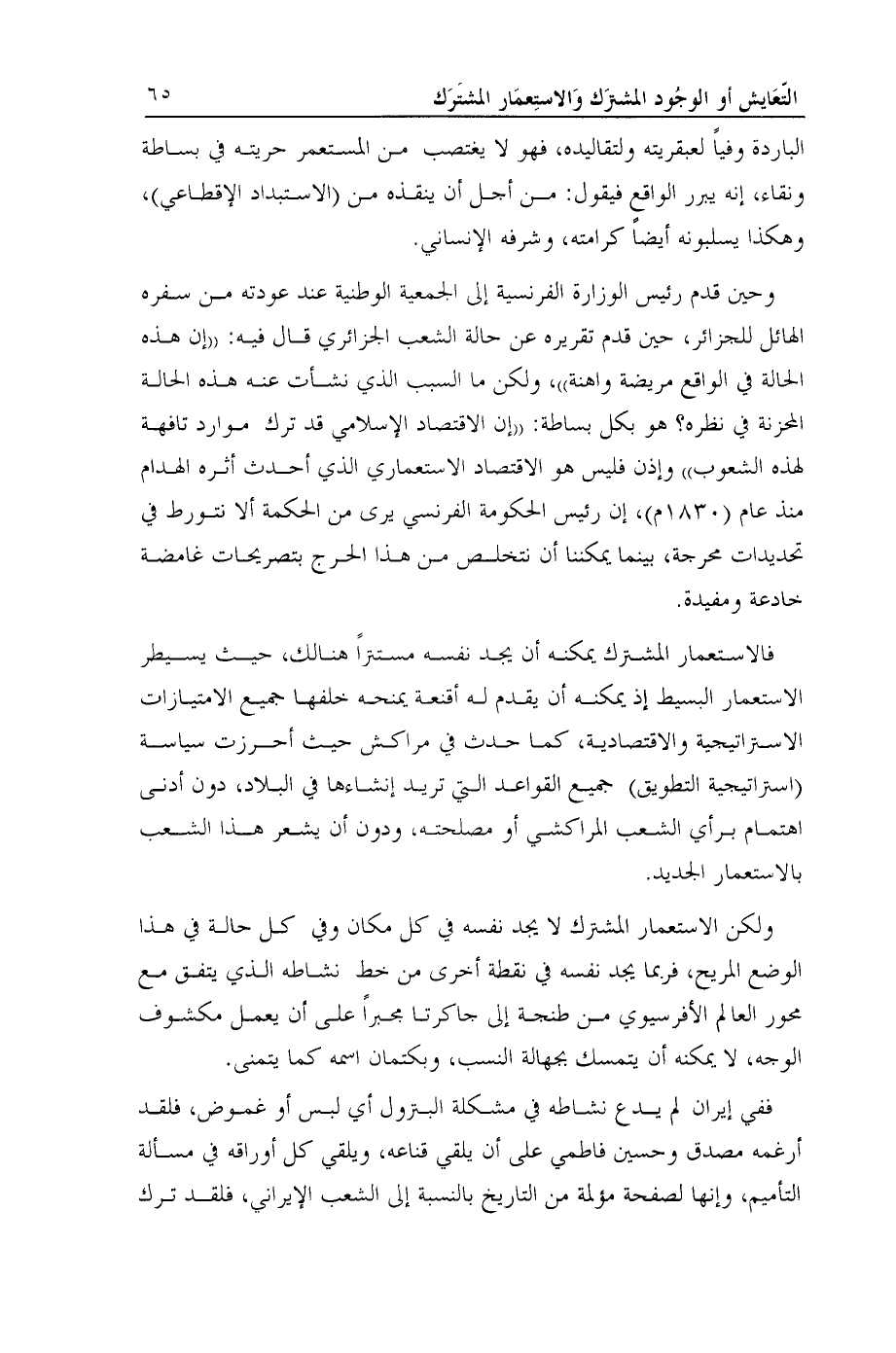 وحين قدم رئيس الوزارة الفرنسية إلى الجمعية الوطنية عند عودته من سفره الهائل للجزائر، حين قدم تقريره عن حالة الشعب الجزائري قال فيه: ((إن هذه الحالة في الواقع مريضة واهنة))، ولكن ما السبب الذي نشأت عنه هذه الحالة المحزنة في نظره؛ هو بكل بساطة: ((إن الإقتصاد الإسلامي قد ترك موارد تافهة لهذه الشعوب)) وإذن فليس هو الاقتصاد الاستعماري الذي أحدث أثره الهدام منذ عام (1830م)، إن رئيس الحكومة الفرنسي يرى من الحكمة ألا نتورط في تحديدات محرجة، بينما يمكننا أن نتخلص من هذا الحرج بتصريحات غامضة خادعة ومفيدة.