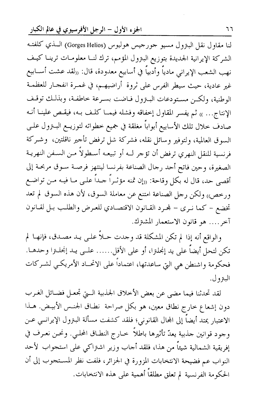 لنا مقاول نقل البترول مسيو جورجيس هوليوس ( Gorges Helios) الذي كلفته الشركة الإيرانية الجديدة بتوزيع البترول المؤمم، ترك لنا معلومات ترينا كيف نهب الشعب الإيراني مادياً وأدبياً في أسابيع معدودة، قال: ((لقد عشت أسابيع غير عادية، حيث سيطر الفرس على ثروة أراضيهم، في غمرة انفجار للعظمة الوطنية، ولكن مستودعات البترول فاضت بسرعة خاطفة، وبذلك توقف الانتاج ... )) ثم يفسر المقاول إخفاقه وفشله فيما كلف به، فيقص علينا أنه صادف خلال تلك الأسابيع أبواباً مغلقة في جميع خطواته لتوزيع البترول على السوق العالمية، ولتوفير وسائل نقله، فشركة شل ترفض تأجير ناقلتين، وشركة فرنسية للنقل النهري ترفض أن تؤجر له أو تبيعه أسطولاً من السفن النهرية الصغيرة، وحين فاتح أحد رجال الصناعة بفرنسا لينتهز فرصة سوق مربحة إلى أقصى حد، قال له بكل وقاحة: ((إن ثمنه مؤثراً جداً على ما فيه من تواضع ورخص)) ولكن رجل الصناعة امتنع عن معاملة السوق، لأن هذه السوق لم تعد تخضع- كما نرى- لمجرد القانون الاقتصادي للعرض والطلب بل لقانون آخر .... هو قانون الاستعمار المشترك.