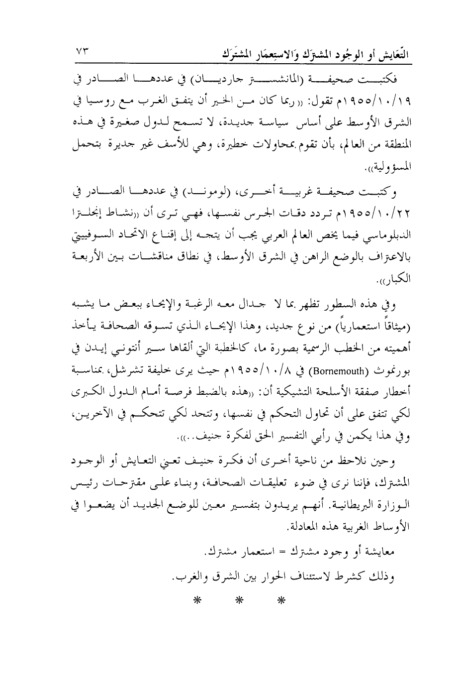 وفي هذه السطور تظهر بما لا جدال معه الرغبة والإيحاء ببعض ما يشبه (ميثاقاً استعمارياً) من نوع جديد، وهذا الإيحاء الذي تسوقه الصحافة يأخذ أهميته من الخطب الرسمية بصورة ما، كالخطبة التي ألقاها سير أنتوني إيدن في بورنموث ( Bornemouth) في 8/ 10/ 1955م حيث يرى خليفة تشرشل، بمناسبة أخطار صفقة الأسلحة التشيكية أن: ((هذه بالضبط فرصة أمام الدول الكبرى لكي تتفق على أن تحاول التحكم في نفسها، وتتحد لكي تتحكم في الآخرين، وفي هذا يكمن في رأي التفسير الحق لفكرة جنيف .. )).