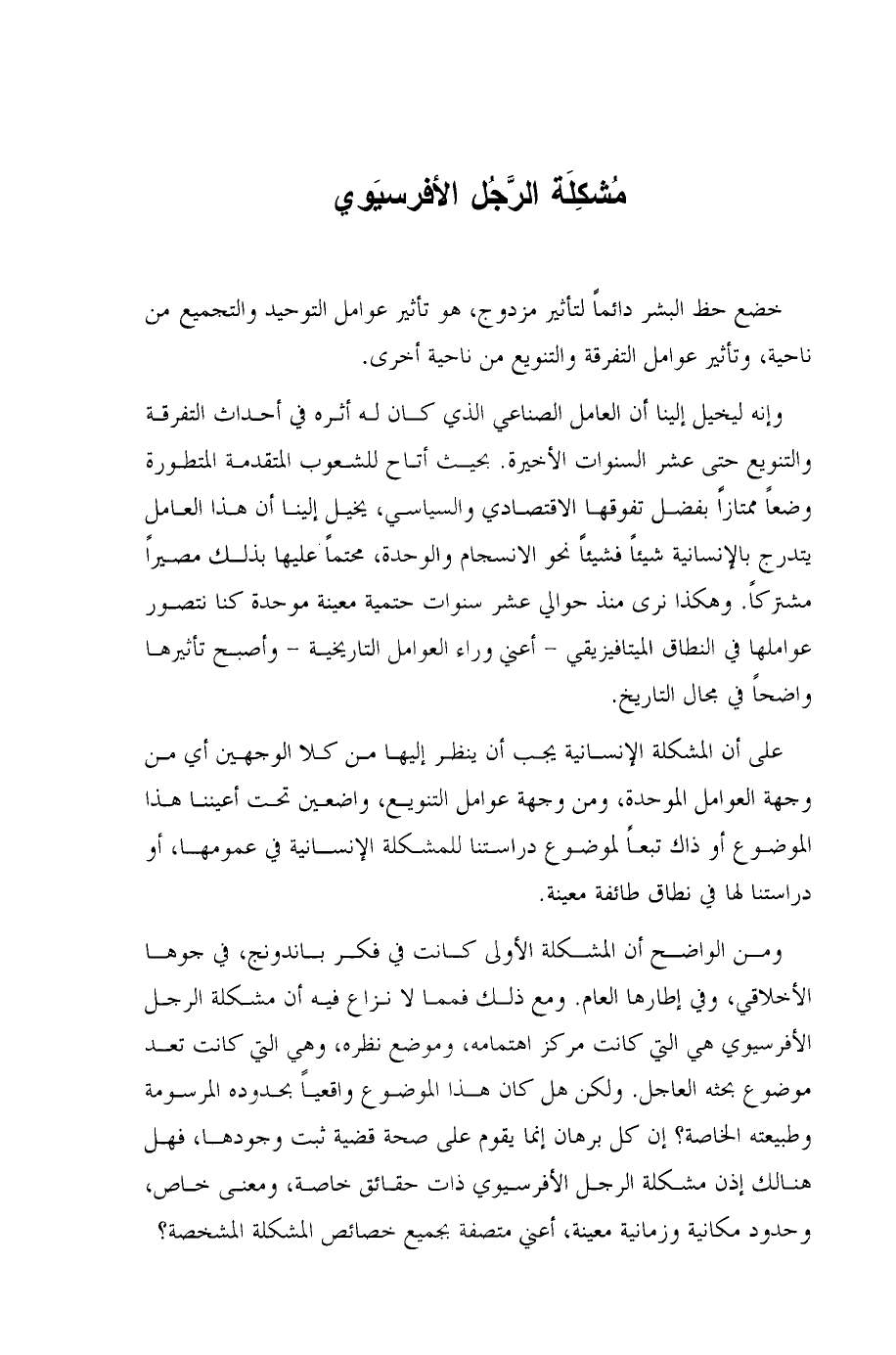 ومن الواضح أن المشكلة الأولى كانت في فكر باندونج، في جوها الأخلاقي، وفي إطارها العام. ومع ذلك فمما لا نزاع فيه أن مشكلة الرجل الأفرسيوي هي التي كانت مركز اهتمامه، وموضع نظره، وهي التي كانت تعد موضوع بحثه العاجل. ولكن هل كان هذا الموضوع واقعياً بحدوده المرسومة وطبيعته الخاصة؛ إن كل برهان إنما يقوم على صحة قضية ثبت وجودها، فهل هنالك إذن مشكلة الرجل الأفرسيوي ذات حقائق خاصة، ومعنى خاص، وحدود مكانية وزمانية معينة، أعني متصفة بجميع خصائص المشكلة المشخصة؛