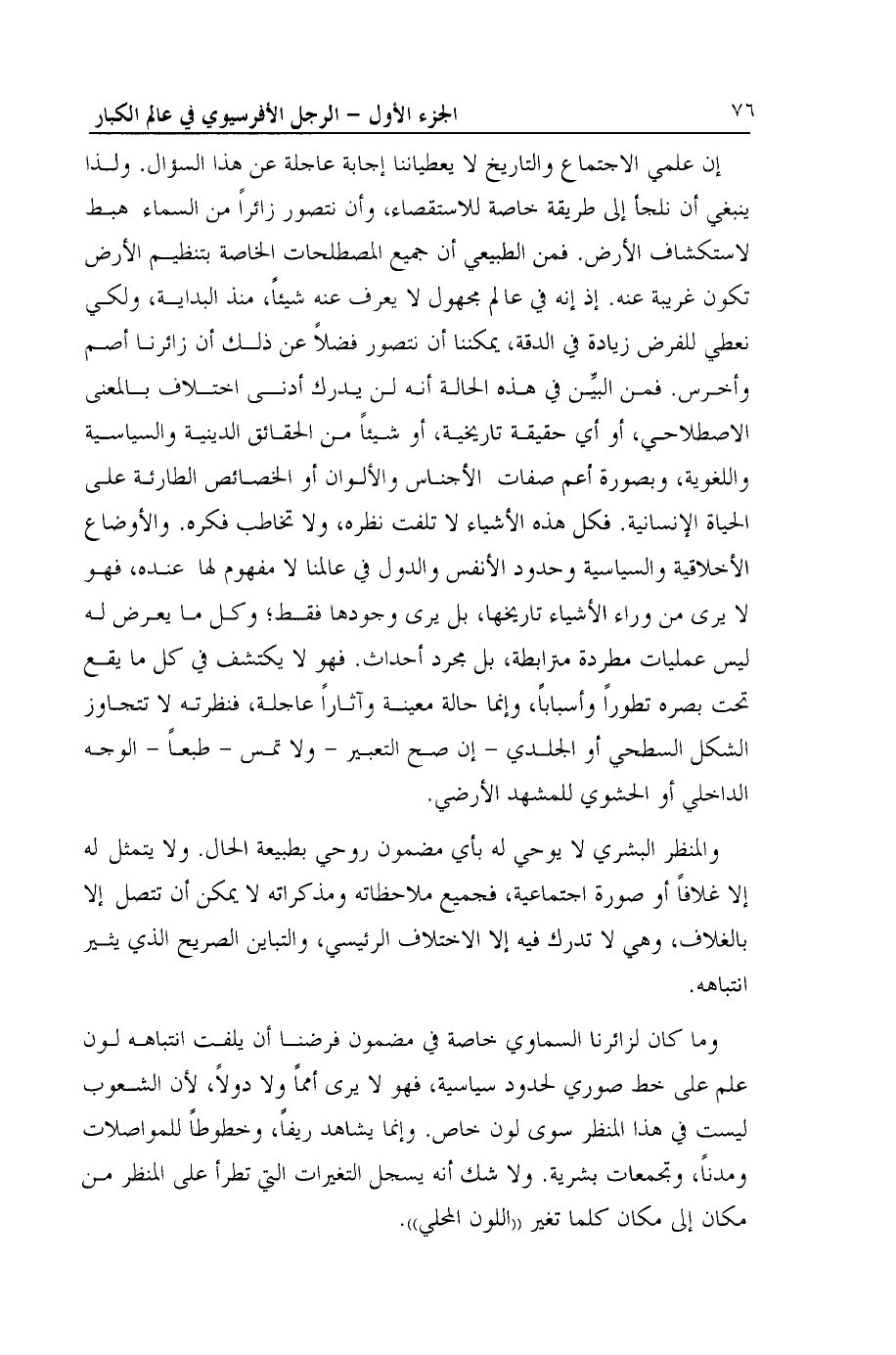 وما كان لزائرنا السماوي خاصة في مضمون فرضنا أن يلفت انتباهه لون علم على خط صوري لحدود سياسية، فهو لا يرى أمماً ولا دولاً، لأن الشعوب ليست في هذا المنظر سوى لون خاص. وإنما يشاهد ريفاً، وخطوطاً للمواصلات ومدناً، وتجمعات بشرية. ولا شك أنه يسجل التغيرات التي تطرأ على النظر من مكان إلى مكان كلما تغير ((اللون المحلي)).