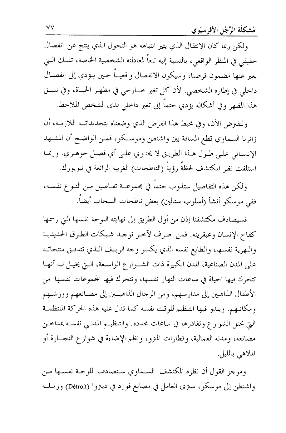 ولنفترض الآن، وفي محيط هذا الفرض الذي وضعناه بتحديداته اللازمة، أن زائرنا السماوي قطع المسافة بين واشنطن وموسكو، فمن الواضح أن المشهد الإنساني على طول هذا الطريق لا يحتوي على أي فصل جوهري. وربما استلفت نظر المكتشف لحظةً رؤيةُ (الناطحات) الغريبة الرائعة في نيويورك.