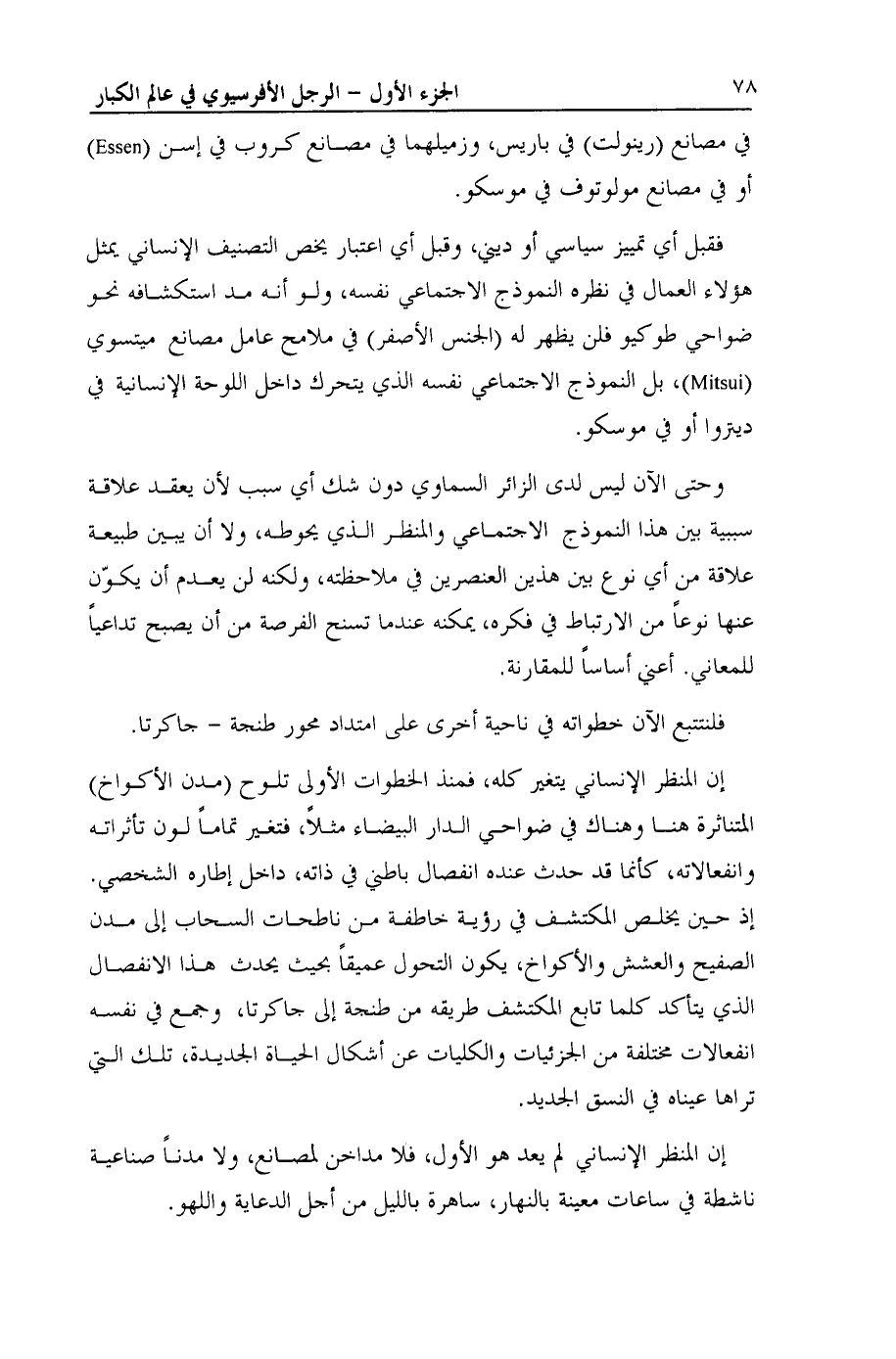 فقبل أي تمييز سياسي أو ديني، وقبل أي اعتبار يخص التصنيف الإنساني يمثل هؤلاء العمال في نظره النموذج الاجتماعى نفسه، ولو أنه مد استكشافه نحو ضواحي طوكيو فلن يظهر له (الجنس الأصفر) في ملامح عامل مصانع ميتسوي ( Mitsui)، بل النموذج الاجتماعي نفسه الذي يتحرك داخل اللوحة الإنسانية في ديتروا أو في موسكو.