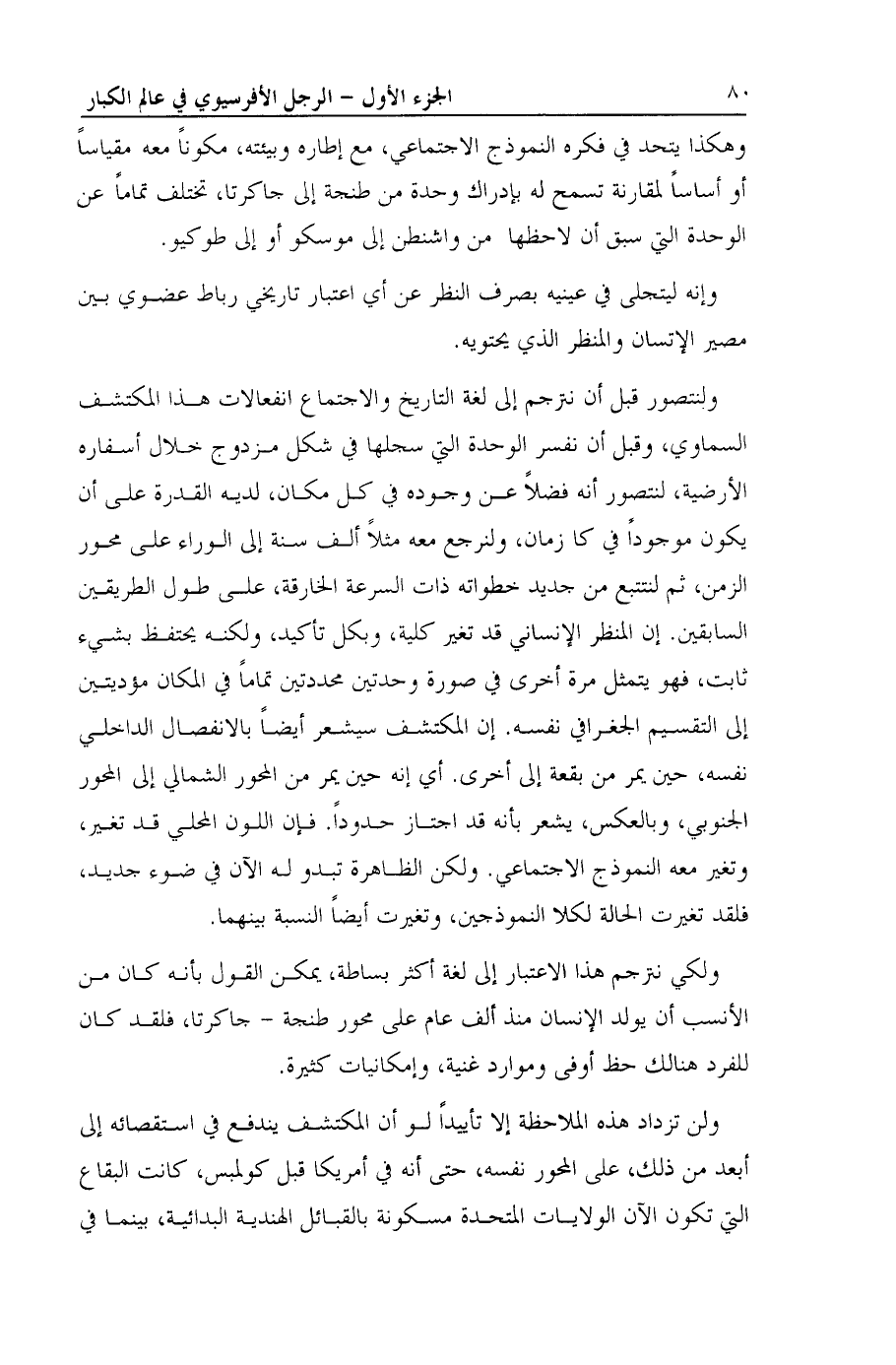 ولنتصور قبل أن نترجم إلى لغة التاريخ والاجتماع انفعالات هذا المكتشف السماوي، وقبل أن نفسر الوحدة التي سجلها في شكل مزدوج خلال أسفاره الأرضية، لنتصور أنه فضلاً عن وجوده في كل مكان، لديه القدرة على أن يكون موجوداً في كل زمان، ولنرجع معه مثلاً ألف سنة إلى الوراء على محور الزمن، ثم لنتتبع من جديد خطواته ذات السرعة الخارقة، على طول الطريقين السابقين. إن المنظر الإنساني قد تغير كلية، وبكل تأكيد، ولكنه يحتفظ بشيء ثابت، فهو يتمثل مرة أخرى في صورة وحدتين محددتين تماماً في المكان مؤديتين إلى التقسيم الجغرافي نفسه. إن المكتشف سيشعر أيضاً بالانفصال الداخلي نفسه، حين يمر من بقعة إلى أخرى. أي إنه حين يمر من المحور الشمالي إلى المحور الجنوبي، وبالعكس، يشعر بأنه قد اجتاز حدوداً. فإن اللون المحلي قد تغير، وتغير معه النموذج الاجتماعي. ولكن الظاهرة تبدو له الآن في ضوء جديد، فلقد تغيرت الحالة لكلا النموذجين، وتغيرت أيضاً النسبة بينهما.