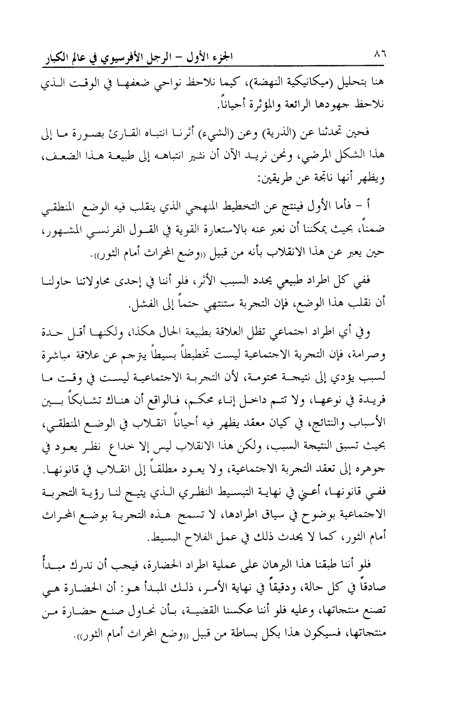 وفي أي اطراد اجتماعي تظل العلاقة بطبيعة الحال هكذا، ولكنها أقل حدة وصرامة، فإن التجربة الاجتماعية ليست تخطيطاً بسيطاً يترجم عن علاقة مباشرة لسبب يؤدي إلى نتيجة محتومة، لأن التجربة الاجتماعية ليست في وقت ما فريدة في نوعها، ولا تتم داخل إناء محكم، فالواقع أن هناك تشابكاً بين الأسباب والنتائج، في كيان معقد يظهر فيه أحياناً انقلاب في الوضع المنطقي، بحيث تسبق النتيجة السبب، ولكن هذا الانقلاب ليس إلا خداع نظر يعود في جوهره إلى تعقد التجربة الاجتماعية، ولا يعود مطلقاً إلى انقلاب في قانونها. ففي قانونها، أعني في نهاية التبسيط النظري الذي يتيح لنا رؤية التجربة الاجتماعية بوضوح في سياق اطرادها، لا تسمح هذه التجربة بوضع المحراث أمام الثور، كما لا يحدث ذلك في عمل الفلاح البسيط.