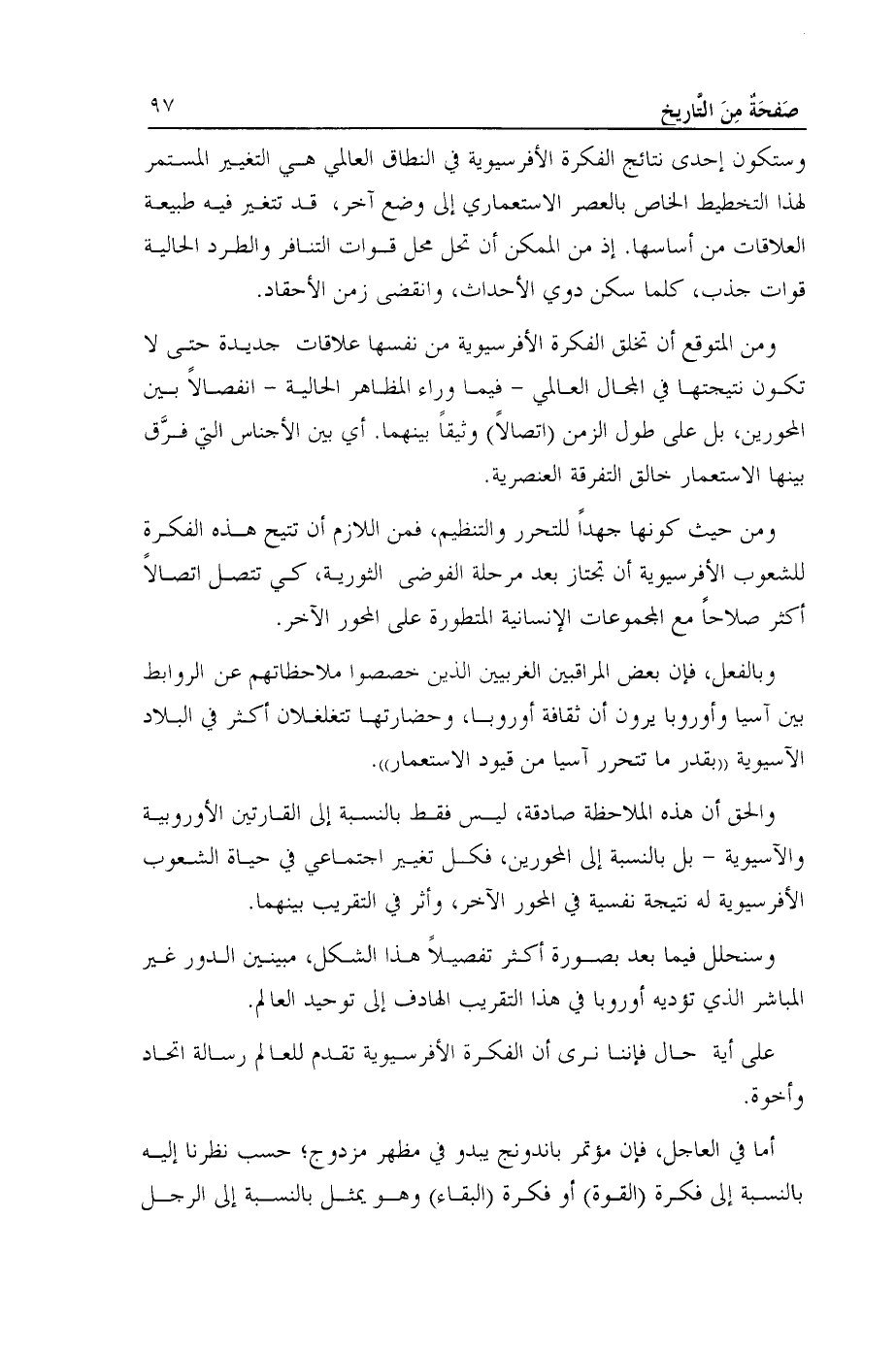وستكون إحدى نتائج الفكرة الأفرسيوية في النطاق العالمي هي التغيير المستمر لهذا التخطيط الخاص بالعصر الاستعماري إلى وضع آخر، قد تتغير فيه طبيعة العلاقات من أساسها. إذ من الممكن أن تحل محل قوات التنافر والطرد الحالية قوات جذب، كلما سكن دوي الأحداث، وانقضى زمن الأحقاد.