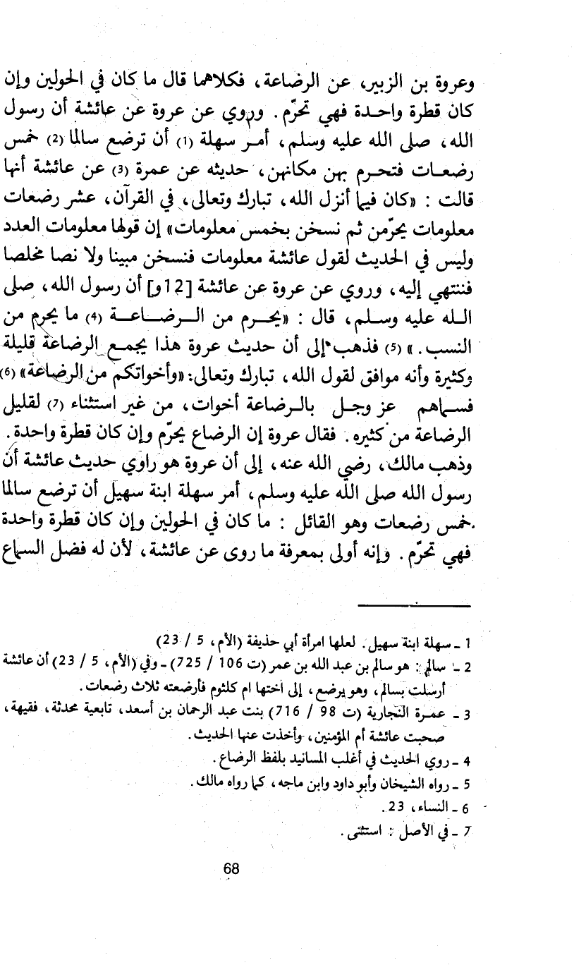 وعروة بن الزبير، عن الرضاعة، فكلاهما قال ما كان في الحولين وإن كان قطرة واحدة فهي تحرّم. وروي عن عروة عن عائشة أن رسول الله، صلى الله عليه وسلم، أمر سهلة أن ترضع سالما خمس رضعات فتحرم بهن مكانهن، حديثه عن عمرة عن عائشة أنها قالت: "كان فيما أنزل الله، تبارك وتعالى، في القرآن، عشر رضعات معلومات يحرّمن ثم نسخن بخمس معلومات" إن قولها معلومات العدد وليس في الحديث لقول عائشة معلومات فنسخن مبينا ولا نصا مخلصا فننتهي إليه، وروي عن عروة عن عائشة [12 و] أن رسول الله، صلى الله عليه وسلم، قال: "يحرم من الرضاعة ما يحرم من النسب." فذهب إلى أن حديث عروة هذا يجمع الرضاعة قليلة وكثيرة وأنه موافق لقول الله، تبارك وتعالى: {وأخواتكم من الرضاعة} فسماهم عز وجل بالرضاعة أخوات، من غير استثناء لقليل الرضاعة من كثيره. فقال عروة إن الرضاع يحرّم وإن كان قطرة واحدة. وذهب مالك، رضى الله عنه، إلى أن عروة هو راوي حديث عائشة أن رسول الله صلى الله عليه وسلم، أمر سهلة ابنة سهيل أن ترضع سالما خمس رضعات وهو القائل: ما كان في الحولين وإن كان قطرة واحدة فهي تحرّم. وإنه أولى بمعرفة ما روى عن عائشة، لأن له فضل السماع