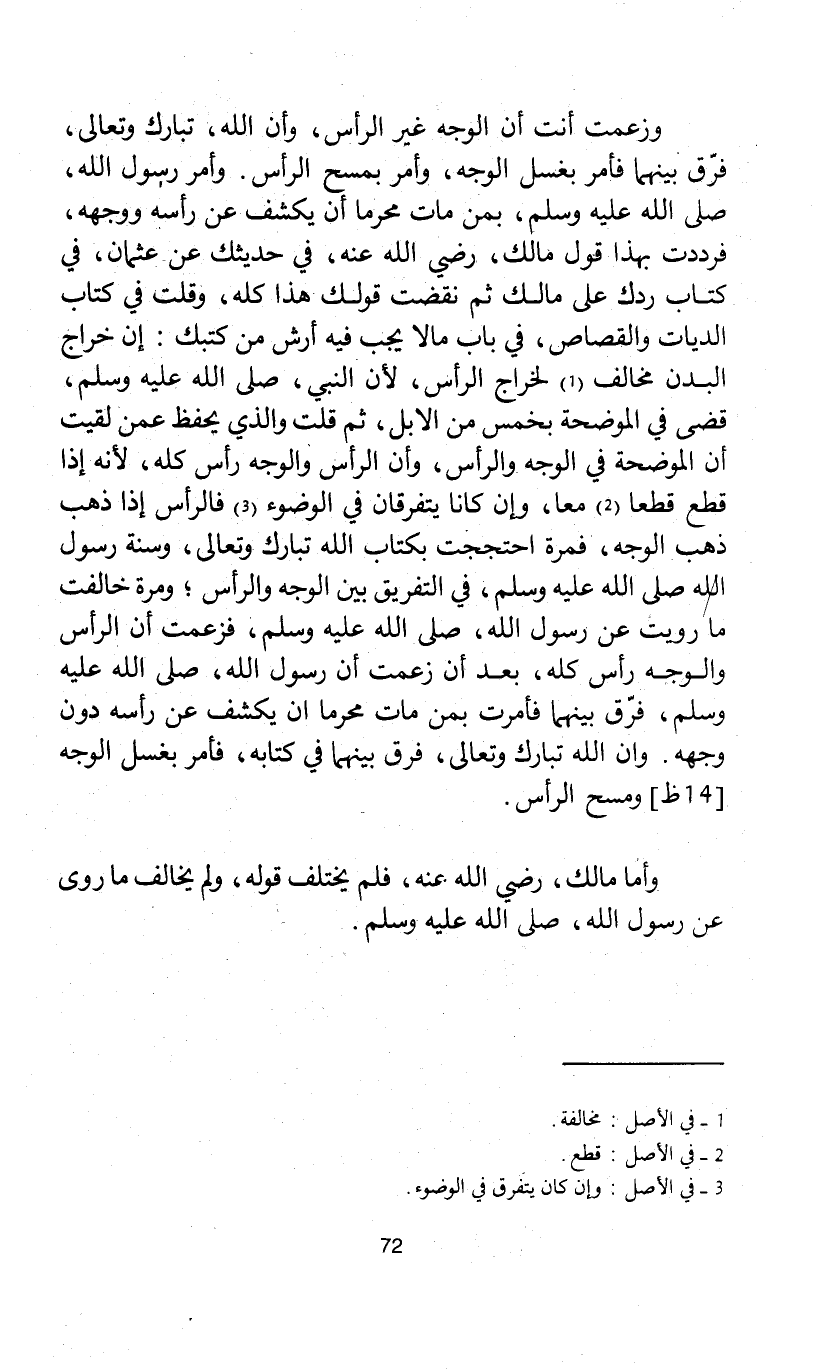 وزعمت أنت أن الوجه غير الرأس، وأن الله، تبارك وتعالى، فرّق بينهما فأمر بغسل الوجه، وأمر بمسح الرأس. وأمر رسول الله، صلى الله عليه وسلم، بمن مات محرما أن يكشف عن رأسه ووجهه، فرددت بهذا قول مالك، رضي الله عنه، في حديثك عن عثمان، في كتاب ردك على مالك ثم نقضت قولك هذا كله، وقلت في كتاب الديات والقصاص، في باب ما لا يجب فيه أرش من كتبك: إن خراج البدن مخالف لخراج الرأس، لأن النبي، صلى الله عليه وسلم، قضى في الموضحة بخمس من الابل، ثم قلت والذي يحفظ عمن لقيت أن الموضحة في الوجه والرأس، وأن الرأس والوجه رأس كله، لأنه إذا قطع قطعا معا، وإن كان يتفرقان في الوضوء فالرأس إذا ذهب ذهب الوجه، فمرة احتججت بكتاب الله تبارك وتعالى، وسنة رسول الله صلى الله عليه وسلم، في التفريق بين الوجه والرأس؛ ومرة خالفت ما رويت عن رسول الله، صلى الله عليه وسلم، فزعمت أن الرأس والوجه رأس كله، بعد أن زعمت أن رسول الله، صلى الله عليه وسلم، فرّق بينهما فأمرت بمن مات محرما ان يكشف عن رأسه دون وجهه. وإن الله تبارك وتعالى، فرق بينهما في كتابه، فأمر بغسل الوجه [14 ظ] ومسح الرأس.