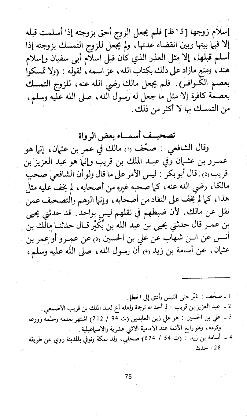 وقال الشافعي: صحّف مالك في عمر بن عثمان، إنما هو عمرو بن عثمان وفي عبد الملك بن قريب وإنما هو عبد العزيز بن قريب. قال أبو بكر: ليس الأمر على ما قال ولو أن الشافعي صحب مالكا، رضى الله عنه، كما صحبه غيره من أصحابه، وإنما الوهم والتصحيف عمن نقل عن مالك، لأن ضبطهم في نقلهم ليس بواحد. قد حدثني يحيى بن عمر قال حدثني يحيى بن عبد الله بن بكير قال حدثنا مالك بن أنس عن ابن شهاب عن على بن الحسين عن عمرو أو عمر بن عثمان، عن أسامة بن زيد أن رسول الله، صلى الله عليه وسلم،
