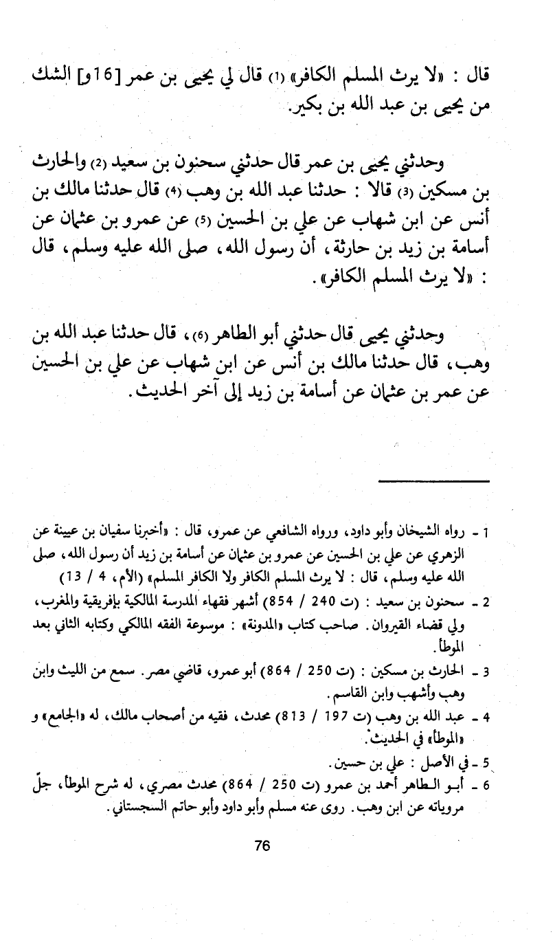 وحدثني يحيى بن عمر قال حدثني سحنون بن سعيد والحارث بن مسكين قالا: حدثنا عبد الله بن وهب قال حدثنا مالك بن أنس عن ابن شهاب عن علي بن الحسين عن عمرو بن عثمان عن أسامة بن زيد بن حارثة، أن رسول الله، صلى الله عليه وسلم، قال: "لا يرث المسلم الكافر".