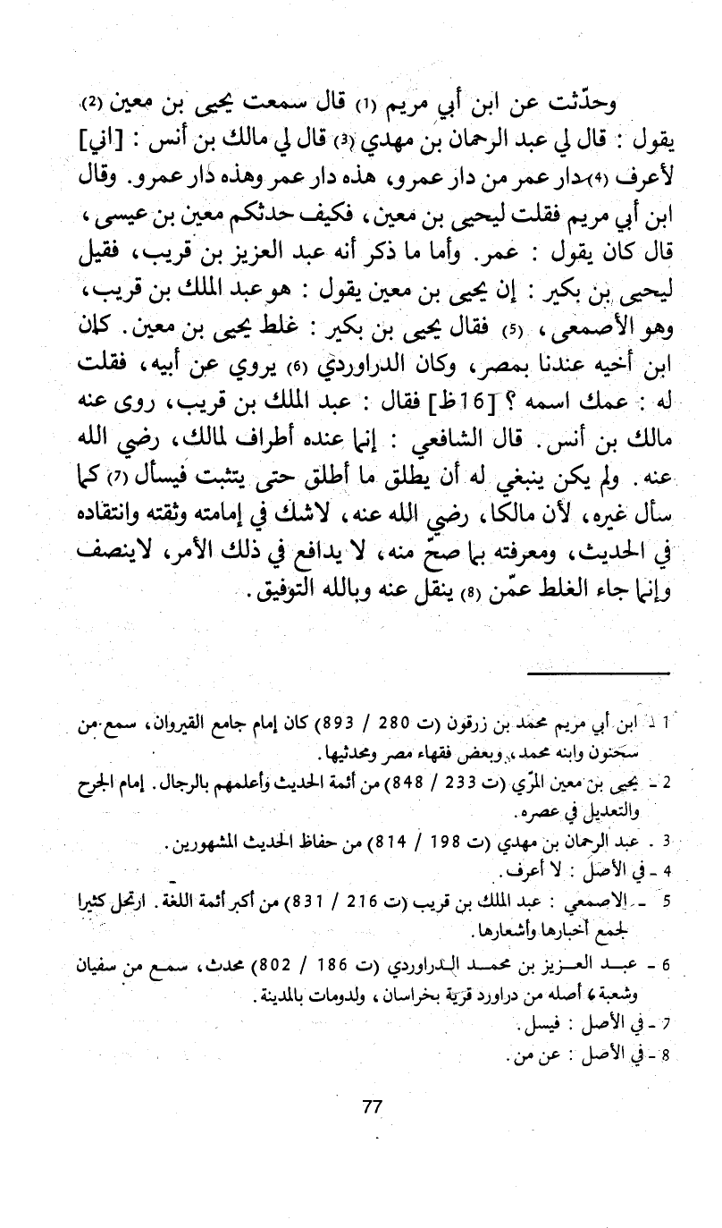 وحدّثت عن ابن أبي مريم قال سمعت يحيى بن معين يقول: قال لي عبد الرحمان بن مهدي قال لي مالك بن أنس: [اني] لأعرف دار عمر من دار عمرو، هذه دار عمر وهذه دار عمرو. وقال ابن أبي مريم فقلت ليحيى بن معين، فكيف حدثكم معين بن عيسى، قال كان يقول: عمر. وأما ما ذكر أنه عبد العزيز بن قريب، فقيل ليحيى بن بكير: إن يحيى بن معين يقول: هو عبد الملك بن قريب، وهو الأصمعى، فقال يحيى بن بكير: غلط يحيى بن معين. كان ابن اخيه عندنا بمصر، وكان الدراوري يروي عن أبيه، فقلت له: عمك اسمه؟ [16 ظ] فقال: عبد الملك بن قريب، روى عنه مالك بن أنس. قال الشافعي: إنما عنده أطراف لمالك، رضي الله عنه. ولم يكن ينبغي له أن يطلق ما أطلق حتى يتثبت فيسأل كما سأل غيره، لأن مالكا، رضي الله عنه، لا شك في إمامته وثقته وانتقاده في الحديث، ومعرفته بما صحّ منه، لا يدافع في ذلك الأمر، لا ينصف وإنما جاء الغلط عمّن ينقل عنه وبالله التوفيق.