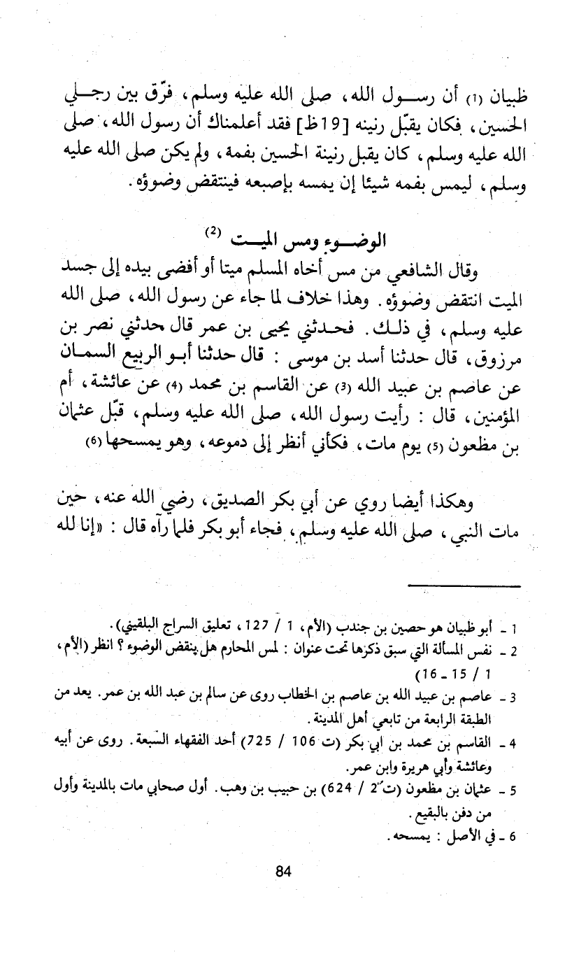 وقال الشافعي من مس أخاه المسلم ميتا أو أفضى بيده إلى جسد الميت انتقض وضوؤه. وهذا خلاف لما جاء عن رسول الله، صلى الله عليه وسلم، في ذلك. فحدثني يحيى بن عمر قال حدثني نصر بن مرزوق، قال حدثنا أسد بن موسى: قال حدثنا أبو الربيع السمان عن عاصم بن عبيد الله عن القاسم بن محمد عن عائشة، أم المؤمنين، قال: رأيت رسول الله، صلى الله عليه وسلم، قبّل عثمان بن مظعون يوم مات، فكأني أنظر إلى دموعه، وهو يمسحها