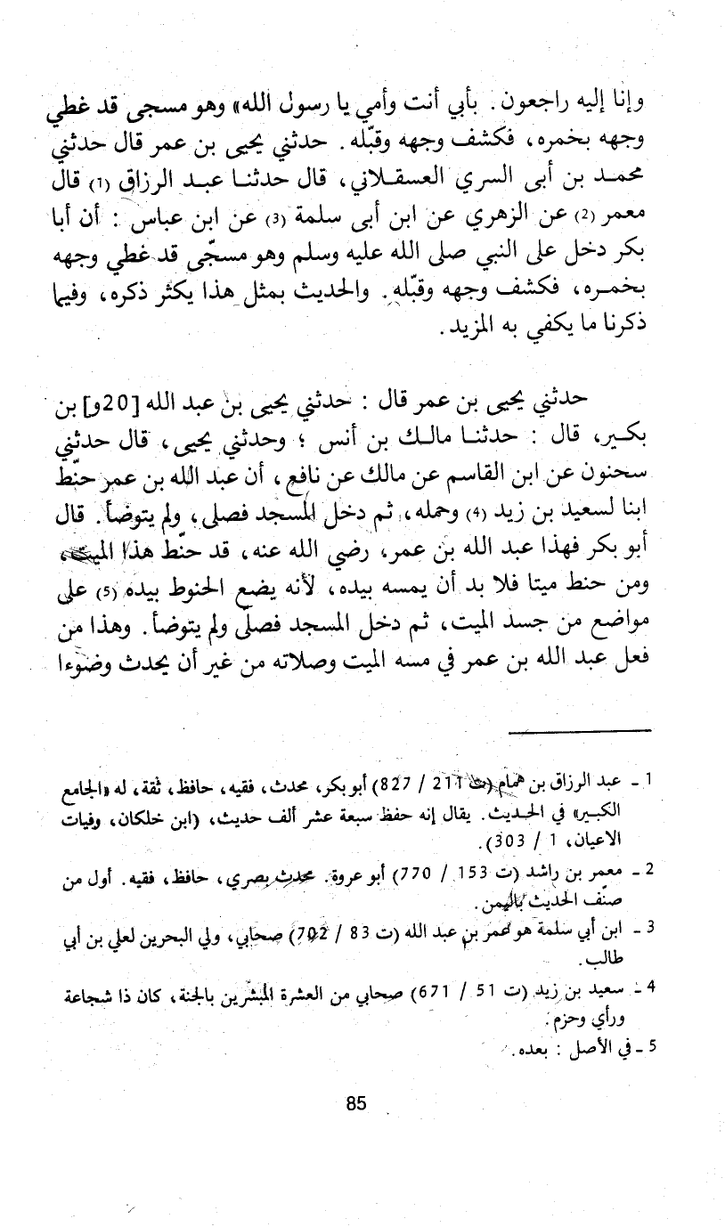 حدثني يحيى بن عمر قال: حدثني يحيى بن عبد الله [20 و] بن بكير، قال: حدثنا مالك بن أنس، وحدثني يحيى، قال حدثني سحنون عن ابن القاسم عن مالك عن نافع، أن عبد الله بن عمر حنّط ابنا لسعيد بن زيد وحمله، ثم دخل المسجد فصلى، ولم يتوضأ. قال أبو بكر فهذا عبد الله بن عمر، رضى الله عنه، قد حنّط هذا الميت، ومن حنط ميتا فلابد أن يمسه بيده، لأنه يضع الحنوط بيده على مواضع من جسد الميت، ثم دخل المسجد فصلى ولم يتوضأ. وهذا من فعل عبد الله بن عمر في مسه الميت وصلاته من غير أن يحدث وضوءًا