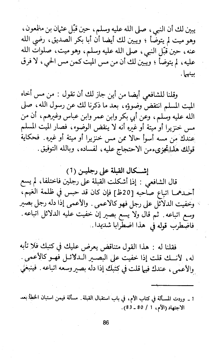 وقلنا للشافعي أيضا من أين جاز لك أن تقول: من مس أخاه الميت المسلم انتقض وضوؤه، بعد ما ذكرنا لك عن رسول الله، صلى الله عليه وسلم، وعن أبي بكر وابن عمر وابن عباس وغيرهم، أن من مس خنزيرا أو ميتة أو غيره أنه لا ينتقض الوضوء، فصار الميت المسلم عندك من مسه أسوأ حالا ممن مس خنزيرا أو ميتة أو غيره. فحكاية قولك هذا تجزئ من الاحتجاج عليه، لفساده، وبالله التوفيق.