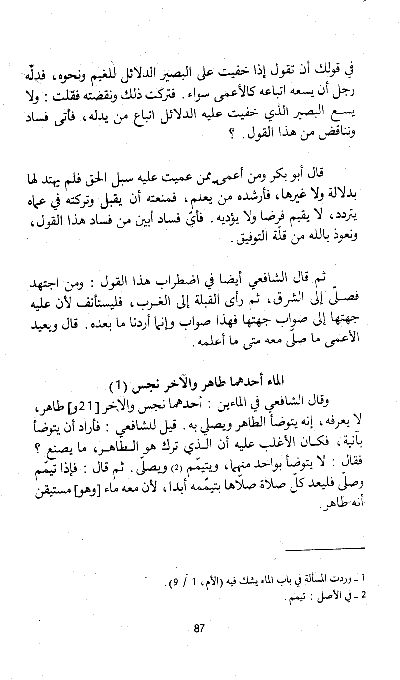 وقال الشافعي في الماءين: أحدهما نجس والآخر [21 و] طاهر، لا يعرفه، إنه يتوضأ الطاهر ويصلي به. قيل للشافعي: فأراد أن يتوضأ بأنية، فكان الأغلب عليه أن الذي ترك هو الطاهر، ما يصنع؟ فقال: لا يتوضأ بواحد منهما، ويتيمّم ويصلّى. ثم قال: فإذا تيمّم وصلّى فليعد كل صلاة صلّاها بتيمّمه أبدا، لأن معه ماء [وهو] مستيقن أنه طاهر.