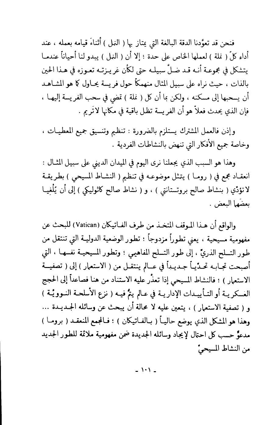 وهذا هو السبب الذي يجعلنا نرى اليوم في الميدان الديني على سبيل المثال: انعقاد مجمع في (روما) يتمثل موضوعه في تنظيم (النشاط المسيحي) بطريقة لا تؤدِّي (بنشاط صالح بروتستانتي)، و (نشاط صالح كاثوليي) إلى أن يُلْغِيا بعضَهما البعض.