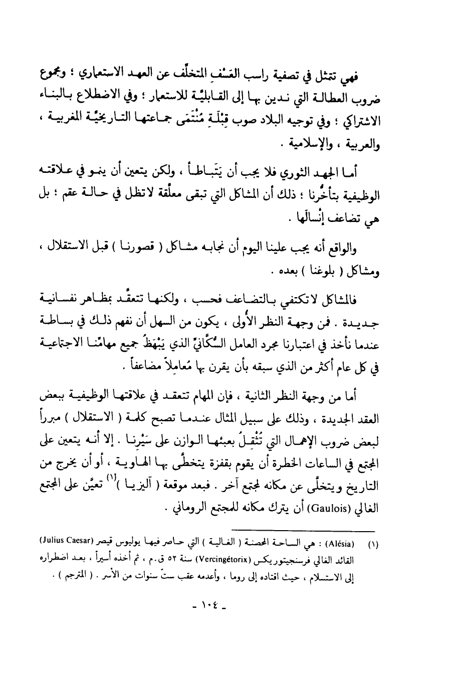 أما من وجهة النظر الثانية، فإن المهام تتعقد في علاقتها الوظيفية ببعض العقد الجديدة، وذلك على سبيل المثال عندما تصبح كلمة (الاستقلال) مبرراً لبعض ضروب الإهمال التي تُثْقِلُ بعبئها الوازن على سَيْرِنا. إلا أنه يتعين على المجتمع في الساعات الخطرة أن يقوم بقفزة يتخطَّى بها الهاوية، أو أن يخرج من التاريخ ويتخلَّى عن مكانه لمجتمع آخر. فبعد موقعة (آليزيا) (¬1) تعيَّن على المجتمع الغالي ( Gaulois) أن يترك مكانه للمجتمع الروماني.