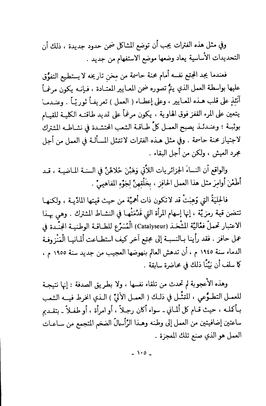 فعندما يجد المجتمع نفسه أمام محنة حاسمة من مِحَنِ تاريخه لا يستطيع التفوُّق عليها بواسطة العمل الذي يتمُّ تصوره ضمن المعايير المعتادة، فإنه يكون مرغماً آنَئِذٍ على قلب هذه المعايير، وعلى إعطاء (العمل) تعريفاً ثوريّاً. وعندما يتعين على المرء القفز فوق الهاوية، يكون مرغماً على تمديد طاقته الكلية للقيام بوثبة؛ وعندئذ يصبح العمل كلَّ طاقة الشعب المحتشدة في نشاطه المشترك لاجتياز محنة حاسمة. وفي مثل هذه الفترات لا تتمثل المسألة في العمل من أجل مجرد العيش، ولكن من أجل البقاء.