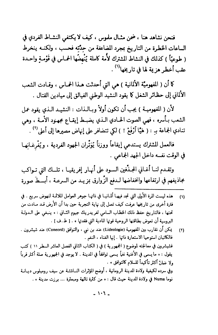 (¬2) يمكن أن نقارب بين المفهومية ( L'ideologie) عند بن نبي، والتوافق ( Concord) عند شيشرون. فالكاتبان استوحيا الاستعارة ذاتها. إنها الغناء، النغم.
