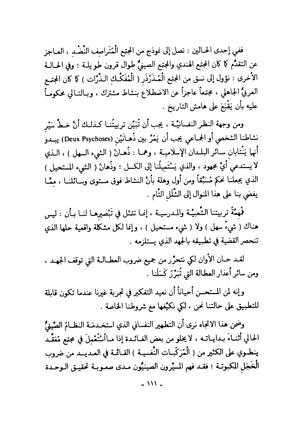 ومن وجهة النظر النفسانيَّة، يجب أن تُبَيِّن تربيتُنا كذلك أنَّ خطَّ سَيْرِ نشاطنا الشخصي أو الجماعي يجب أن يَمُرَّ بين ذُهانَيْنِ ( Deux Psychoses) يبدو أنهما يَنْتابانِ سائر البلدان الإسلامية، وهما: ذُهانُ (الشيء السهل)، الذي لا يستدعي أيَّ مجهود، والذي يَسْتَمِيلُنا إلى الكسل؛ وذُهانُ (الشيء المستحيل) الذي يجعلنا نحم مُسَبَّقاً ومن أول وهلة بأنَّ النشاط فوق مستوى وسائلنا، مِمَّا يفضي بنا على هذا المنوال إلى الشَّلَلِ التَّام.