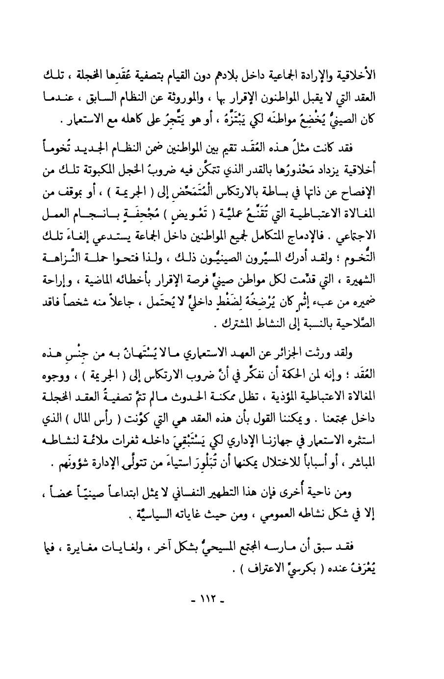فقد كانت مثلُ هذه العُقَد تقيم بين المواطنين ضمن النظام الجديد تُخوماً أخلاقية يزداد مَحْذورُها بالقدر الذي تتمكَّن فيه ضروبُ الخجل المكبوتة تلك من الإفصاح عن ذاتها في بساطة بالارتكاس الْمُتَمَحِّضِ إلى (الجريمة)، أو بموقف من المغالاة الاعتباطية التي تُقَنِّعُ عمليَّة (تَعْويضٍ) مُجْحِفَةٍ بانسجام العمل الاجتماعي. فالإدماج المتكامل لجميع المواطنين داخل الجماعة يستدعي إلغاءَ تلك التُّخوم؛ ولقد أدرك المسيِّرون الصينيُّون ذلك، ولذا فتحوا حملة النَّزاهة الشهيرة، التي قدَّمت لكل مواطن صينيٍّ فرصة الإقرار بأخطائه الماضية، وإراحة ضميره من عبء إثْمٍ كان يُرْضِخُهُ لِضَغْطٍ داخليٍّ لا يُحتَمل، جاعلاً منه شخصاً فاقد الصَّلاحية بالنسبة إلى النشاط المشترك.