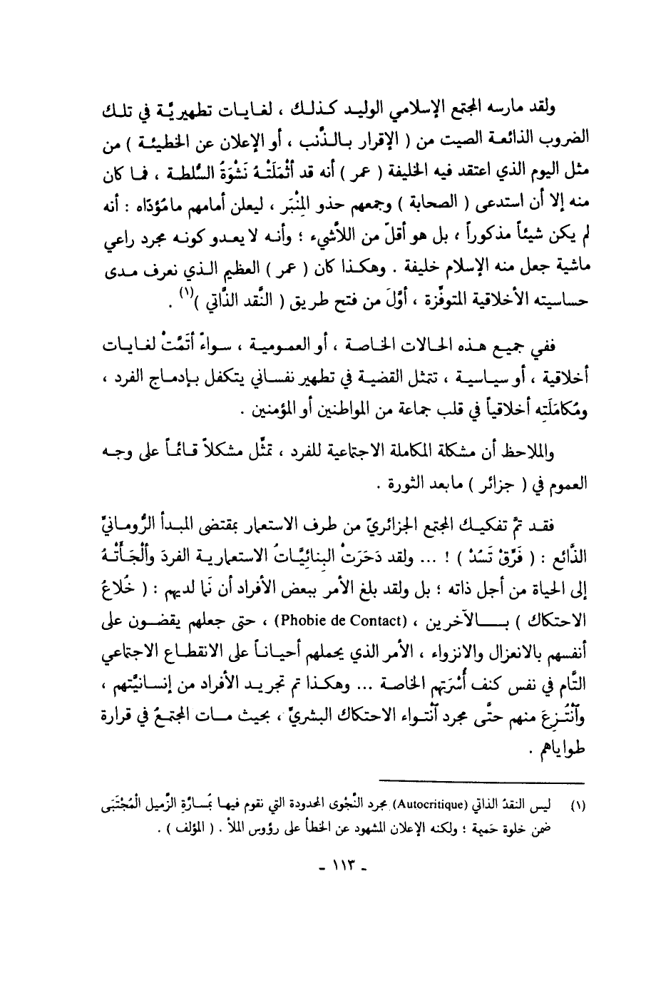 (¬1) ليس النقدُ الذاتي ( Autocritique) مجرد النَّجْوى المحدودة التي نقوم فيها بمُسارَّةِ الزَّميل الْمُجْتَبَى ضمن خلوة حَميمة؛ ولكنه الإعلان المشهود عن الخطأ على رؤوس الملأ. (المؤلف).