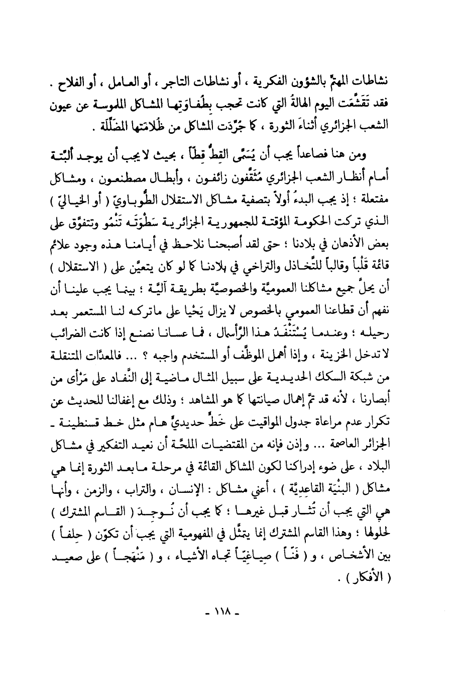 نشاطات المهتمِّ بالشؤون الفكرية، أو نشاطات التاجر، أو العامل، أو الفلاح. فقد تَقَشَّعَت اليوم الهالةُ التي كانت تحجب بِطُفاوَتِها المشاكل الملموسة عن عيون الشعب الجزائري أثناءَ الثورة، كما جُرِّدَت المشاكل من ظُلامَتها المضَلِّلَة.