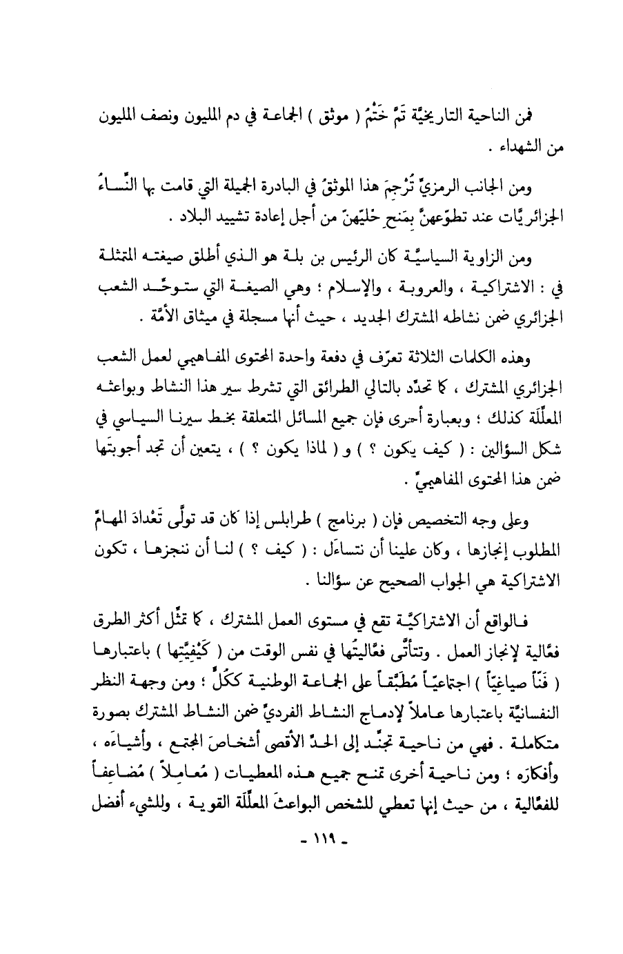 وهذه الكلمات الثلاثة تعرّف في دفعة واحدة المحتوى المفاهيمي لعمل الشعب الجزائري المشترك، كما تحدِّد بالتالي الطرائق التي تشرط سير هذا النشاط وبواعثه المعلِّلَة كذلك؛ وبعبارة أحرى فإن جميع المسائل المتعلقة بخط سيرنا السياسي في شكل السؤالين: (كيف يكون؟) و (لماذا يكون؟)، يتعين أن تجد أجوبتَها ضمن هذا المحتوى المفاهيميِّ.
