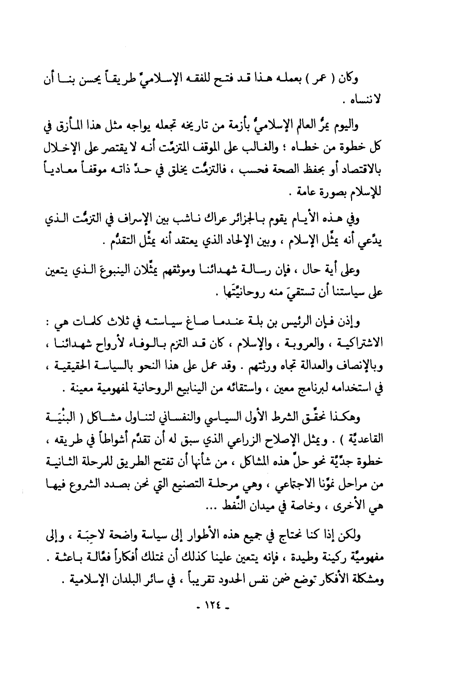 وإذن فإن الرئيس بن بلة عندما صاغ سياسته في ثلاث كلمات هي: الاشتراكية، والعروبة، والإسلام، كان قد التزم بالوفاء لأرواح شهدائنا، وبالإنصاف والعدالة تجاه ورثتهم. وقد عمل على هذا النحو بالسياسة الحقيقية، في استخدامه لبرنامج معين، واستقائه من الينابيع الروحانية لمفهومية معينة.