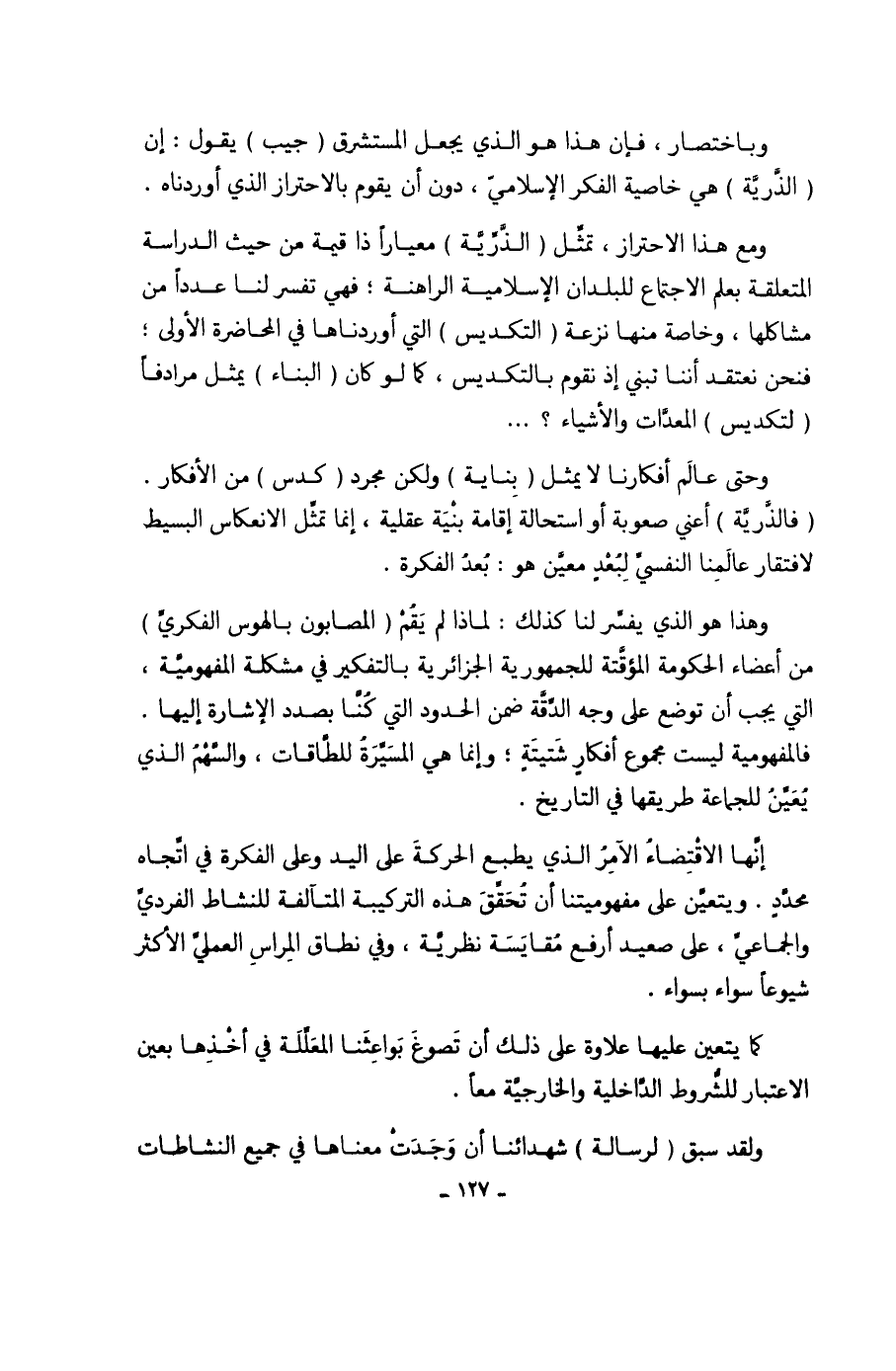 وباختصار، فإن هذا هو الذي يجعل المستشرق (جيب) يقول: إن (الذَّريَّة) هي خاصية الفكر الإسلاميّ، دون أن يقوم بالاحتراز الذي أوردناه.