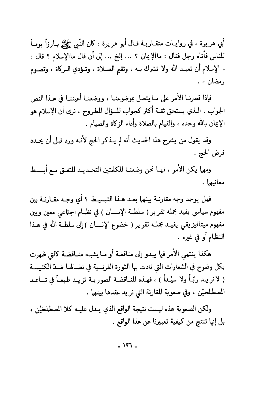 فهل يوجد وجه مقارنة بينهما بعد هذا التبسيط؟ أي وجه مقارنة بين مفهوم سياسي يفيد جمله تقرير (سلطة الإنسان) في نظام اجتماعي معين وبين مفهوم ميتافيزيقي يفيد مجمله تقرير (خضوع الإنسان) إلى سلطة الله في هذا النظام أو في غيره.