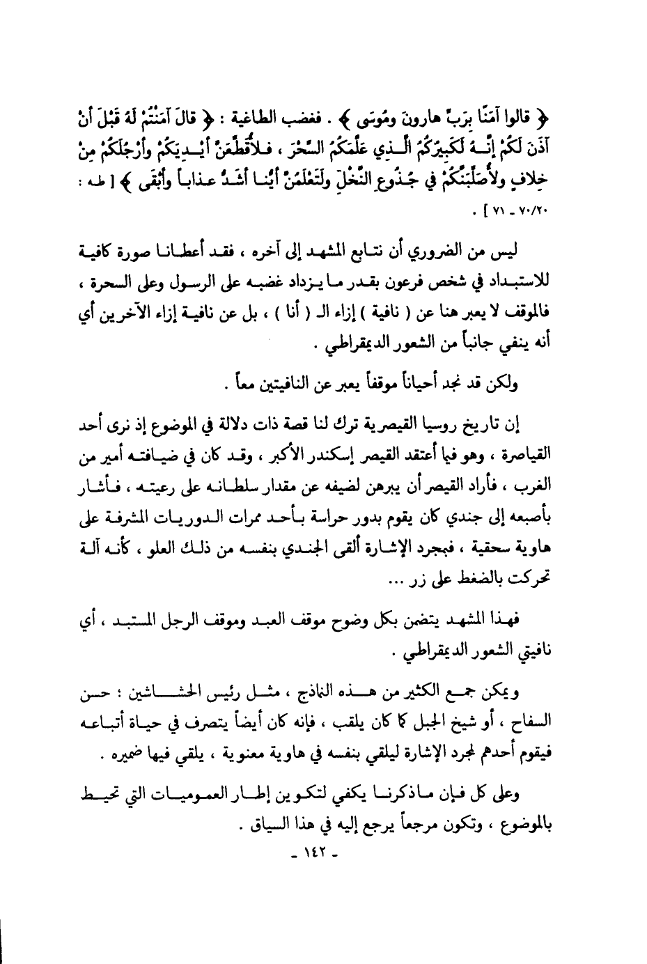 ليس من الضروري أن نتابع المشهد إلى آخره، فقد أعطانا صورة كافية للاستبداد في شخص فرعون بقدر ما يزداد غضبه على الرسول وعلى السحرة، فالموقف لا يعبر هنا عن (نافية) إزاء الـ (أنا)، بل عن نافية إزاء الآخرين أي أنه ينفي جانباً من الشعور الديمقراطي.