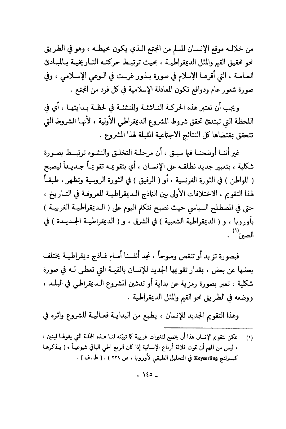 من خلاله موقع الإنسان المسلم من المجتمع الذي يكون محيطه، وهو في الطريق نحو تحقيق القيم والمثل الديمقراطية، بحيث ترتبط حركته التاريخية بالمبادئ العامة، التي أقرها الإسلام في صورة بذور غرست في الوعي الإسلامي، وفي صورة شعور عام ودوافع تكون المعادلة الإسلامية في كل فرد من المجتمع.