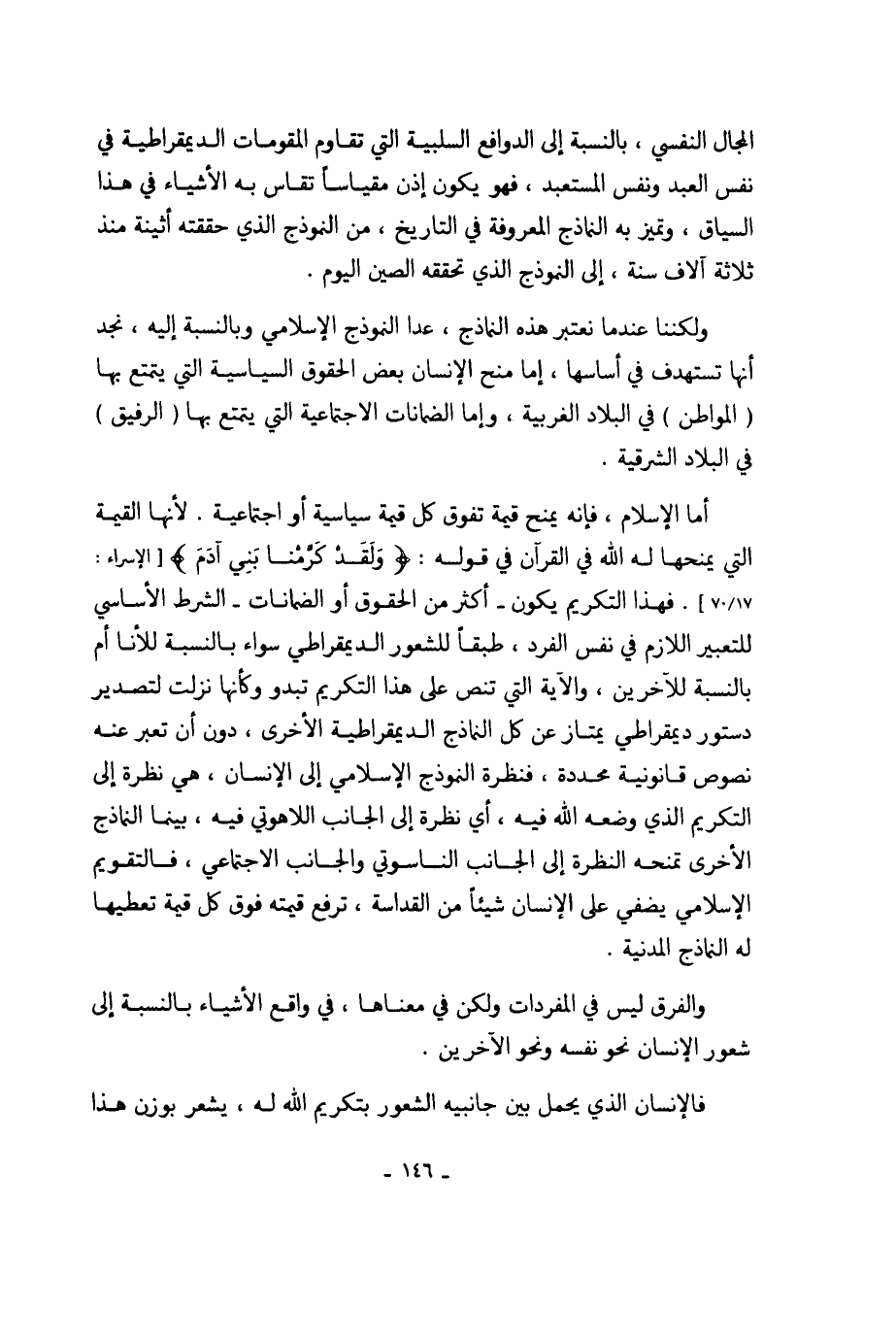 أما الإسلام، فإنه يمنح قيمة تفوق كل قيمة سياسية أو اجتماعية. لأنها القيمة التي يمنحها له الله في القرآن في قوله: {وَلَقَدْ كَرَّمْنَا بَنِي آدَمَ} [الإسراء: 17/ 70]. فهذا التكريم يكون- أكثر من الحقوق أو الضمانات- الشرط الأساسي للتعبير اللازم في نفس الفرد، طبقاً للشعور الديمقراطي سواء بالنسبة للأنا أم بالنسبة للآخرين، والآية التي تنص على هذا التكريم تبدو وكأنها نزلت لتصدير دستور ديمقراطي يمتاز عن كل النماذج الديمقراطية الأخرى، دون أن تعبر عنه نصوص قانونية محددة، فنظرة النموذج الإسلامي إلى الإنسان، هي نظرة إلى التكريم الذي وضعه الله فيه، أي نظرة إلى الجانب اللاهوتي فيه، بينما النماذج الأخرى تمنحه النظرة إلى الجانب الناسوتي والجانب الاجتماعي، فالتقويم الإسلامي يضفي على الإنسان شيئاً من القداسة، ترفع قيمته فوق كل قيمة تعطيها له النماذج المدنية.