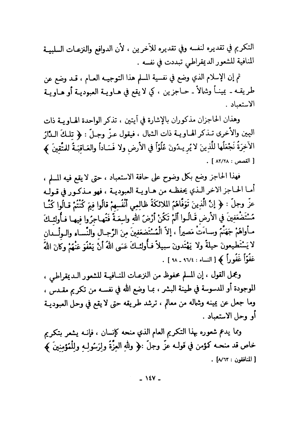 ومجمل القول، إن المسلم محفوظ من النزعات المنافية للشعور الديمقراطي، الموجودة أو المدسوسة في طينة البشر، بما وضع الله في نفسه من تكريم مقدس، وما جعل عن يمينه وشماله من معالم، ترشد طريقه حتى لا يقع في وحل العبودية أو وحل الاستعباد.