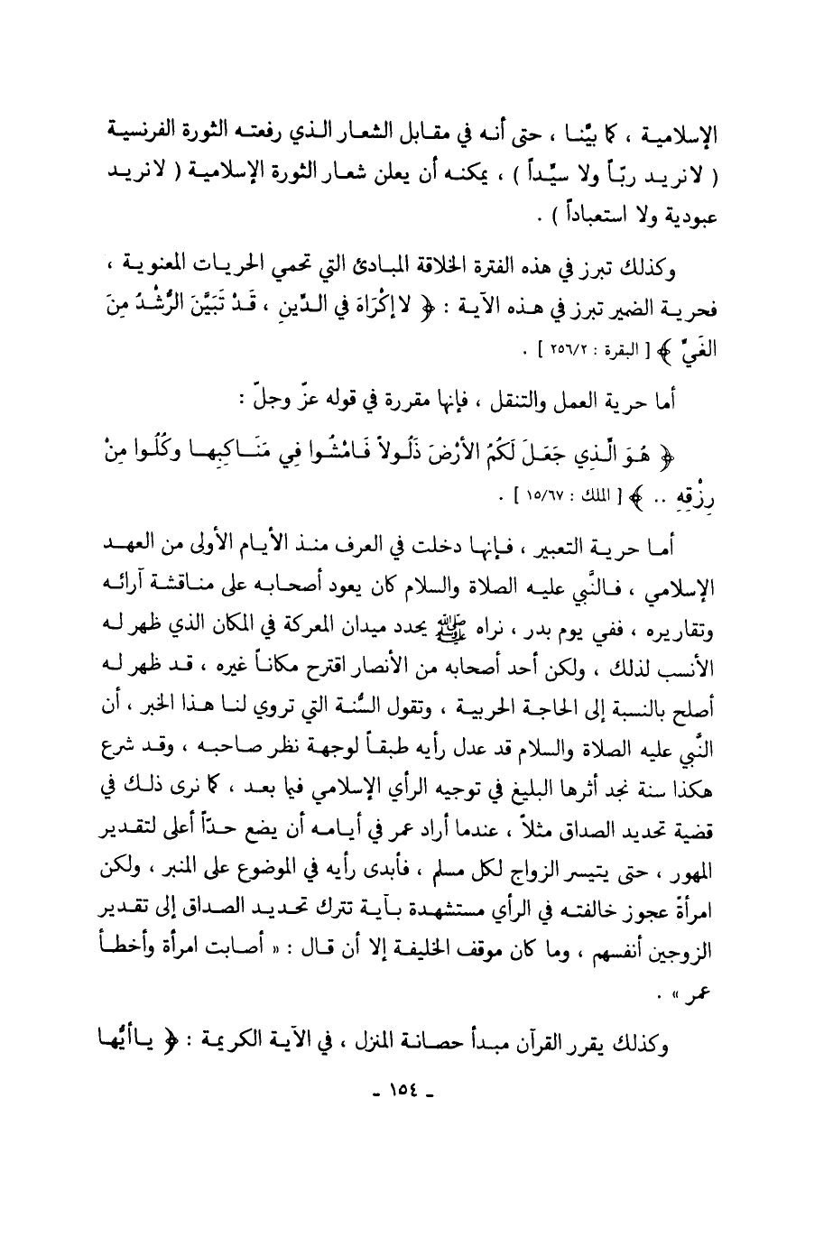 الإسلامية، كما بيَّنا، حتى أنه في مقابل الشعار الذي رفعته الثورة الفرنسية (لا نريد ربّاً ولا سيّداً)، يمكنه أن يعلن شعار الثورة الإسلامية (لا نريد عبودية ولا استعباداً).