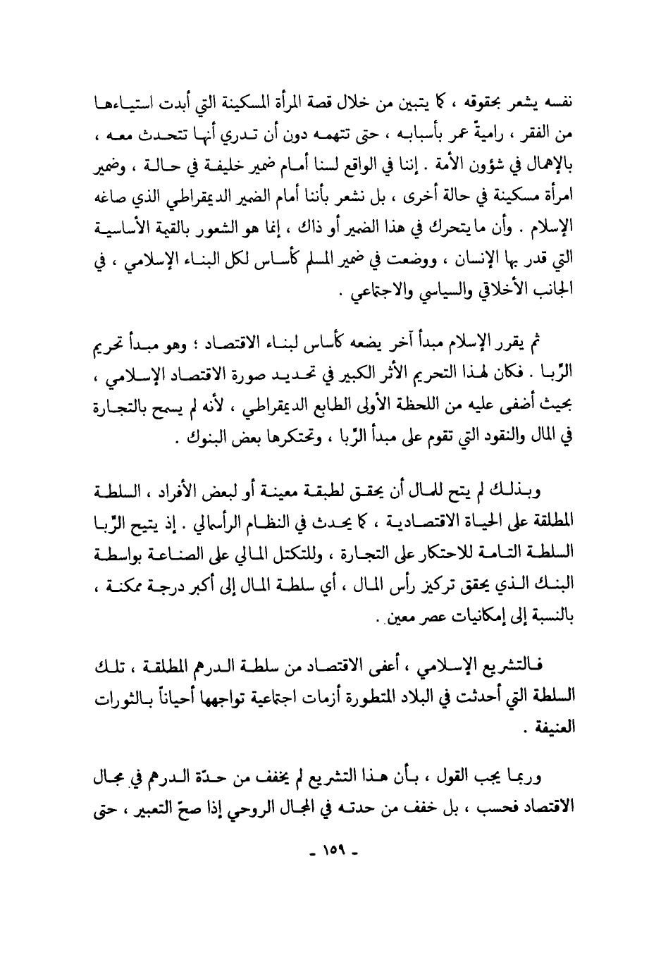 فالتشريع الإسلامي، أعفى الاقتصاد من سلطة الدرهم المطلقة، تلك السلطة التي أحدثت في البلاد المتطورة أزمات اجتماعية تواجهها أحياناً بالثورات العنيفة.