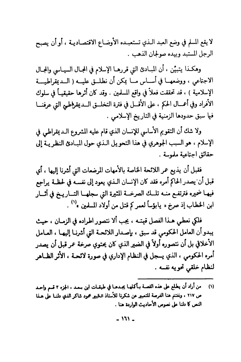 فلكي نعطي هذا الفصل قيمته، يجب ألا نتصور اطراده في الزمان، حيث يبدو أن العامل الحكومي قد سبق، بإصدار اللائحة التي أشرنا إليها، العامل الأخلاقي بل أن نتصوره أولاً في الضمير الذي كان يحتوي صرخة عمر قبل أن يصدر أمره الحكومي، الذي يسجل في النظام الإداري في صورة لائحة، الأثر الظاهر لنظام خلقي تحويه نفسه.